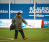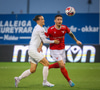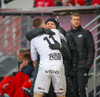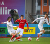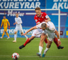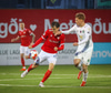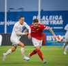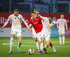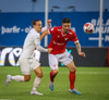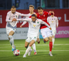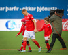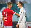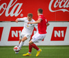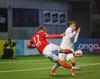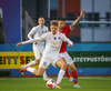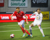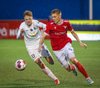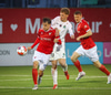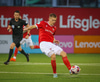 Andri Rúnar við það að komast einn á Anton Ara en Anton Ari er sneggri í boltann og sparkar í innkast.