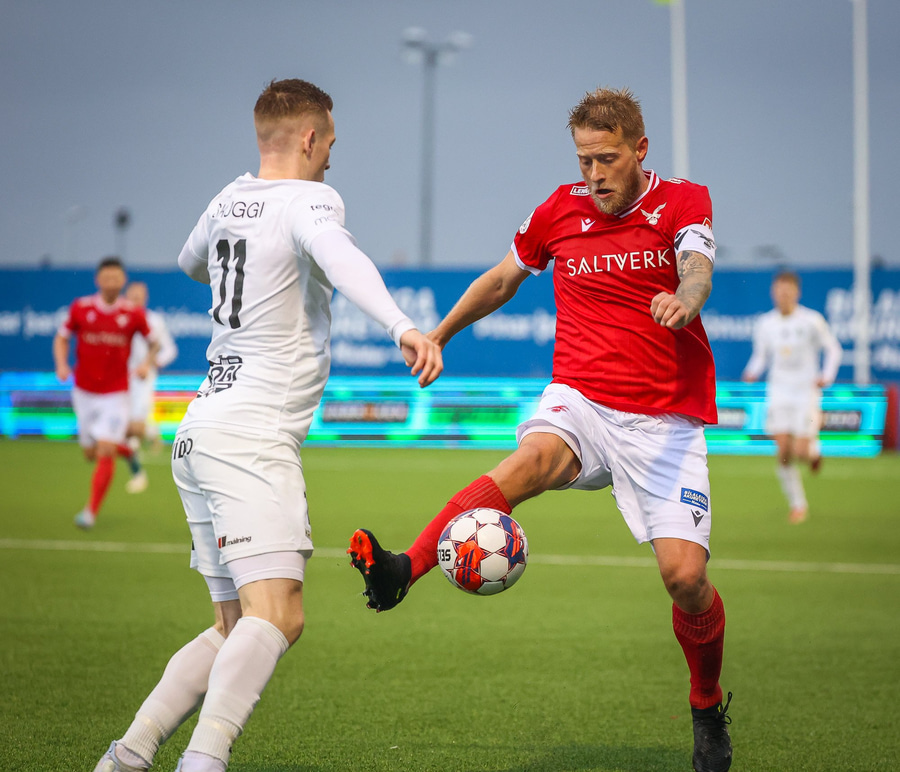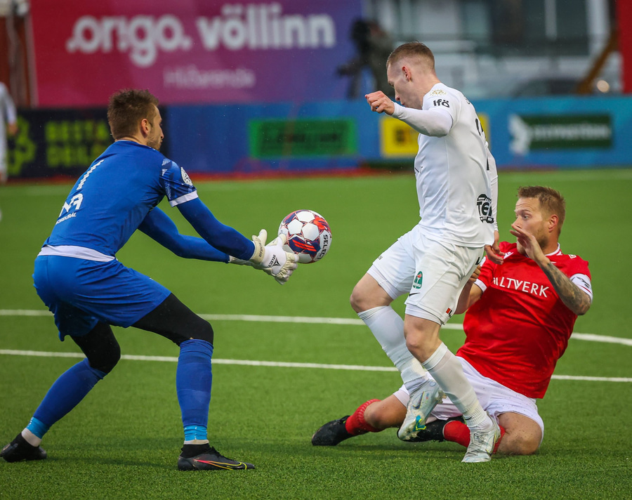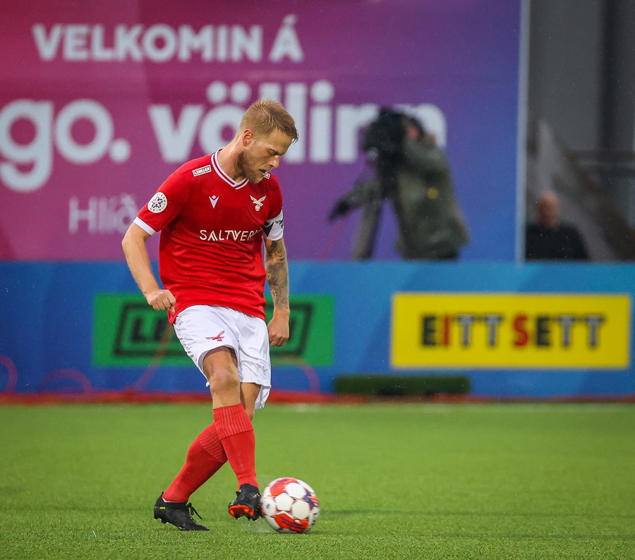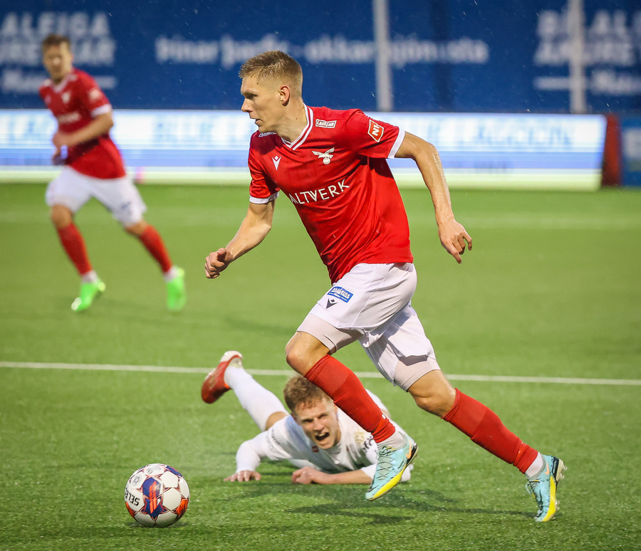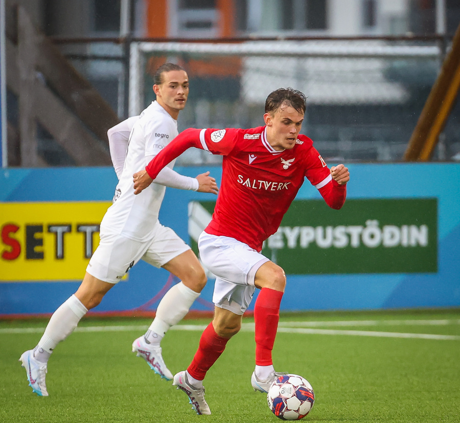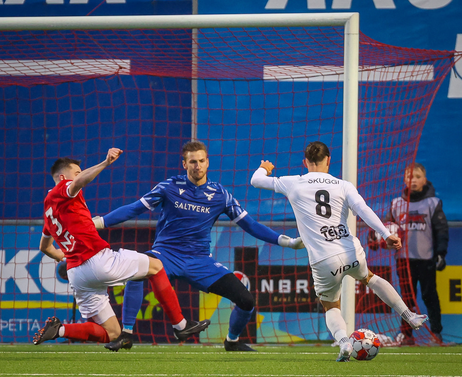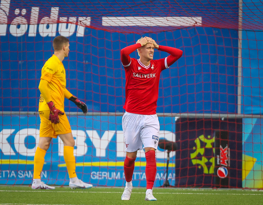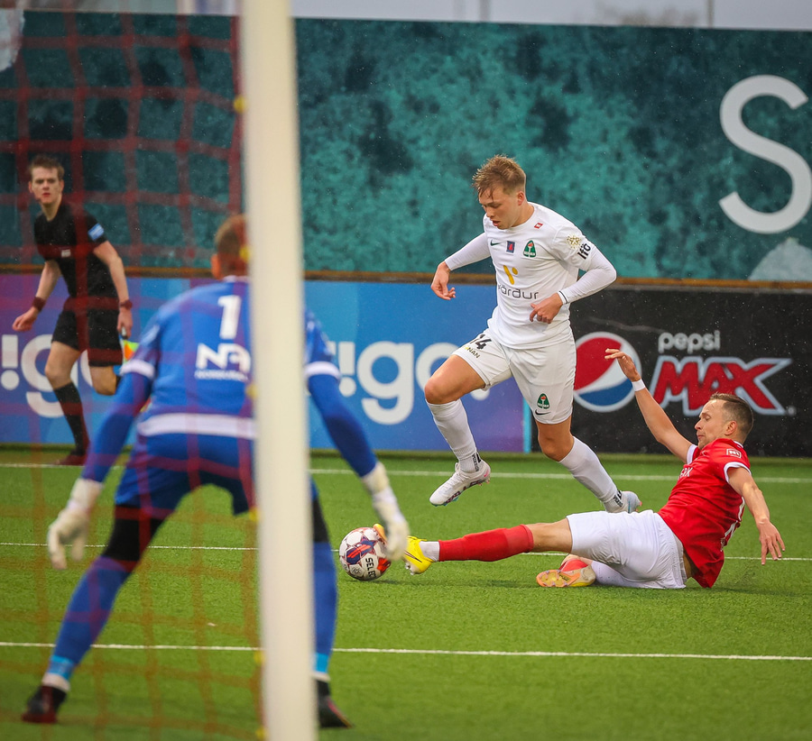 Blikar að komast í ágætis stöðu en Patrik Johannesen skóflar boltanum yfir markið.