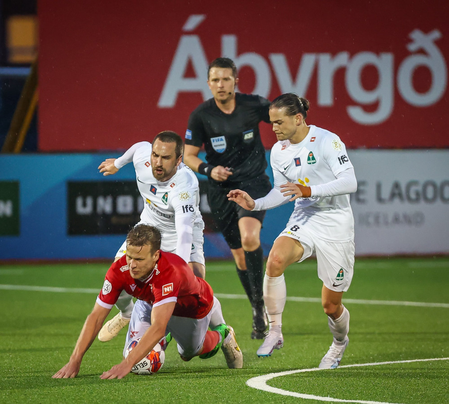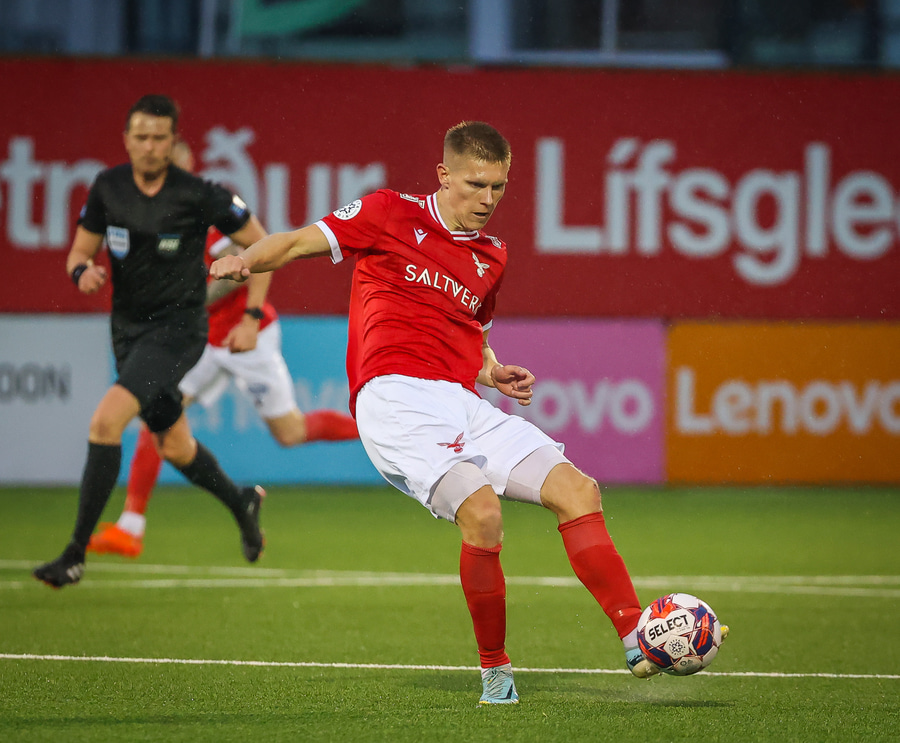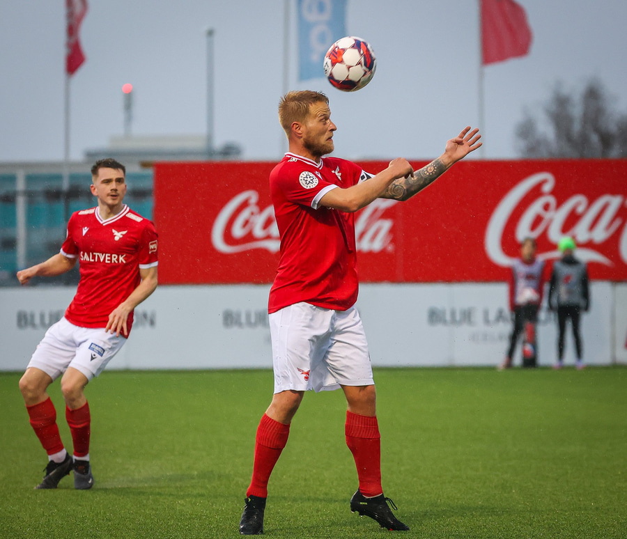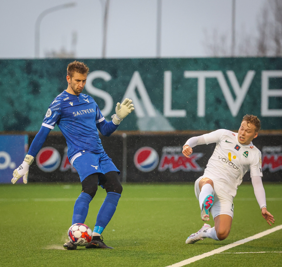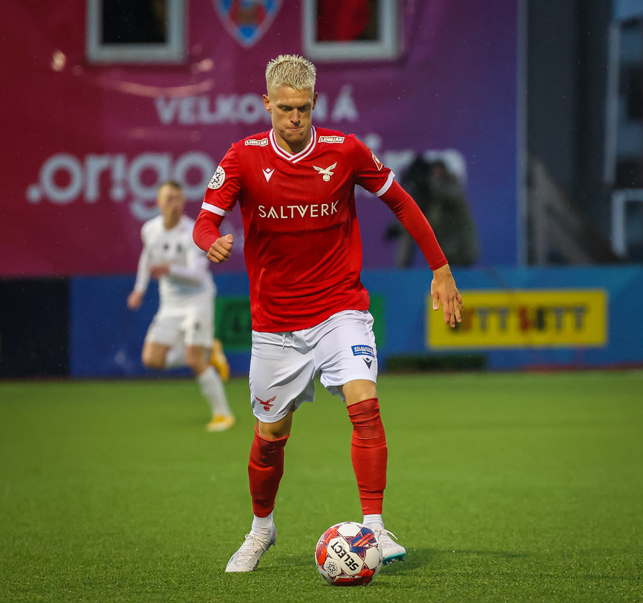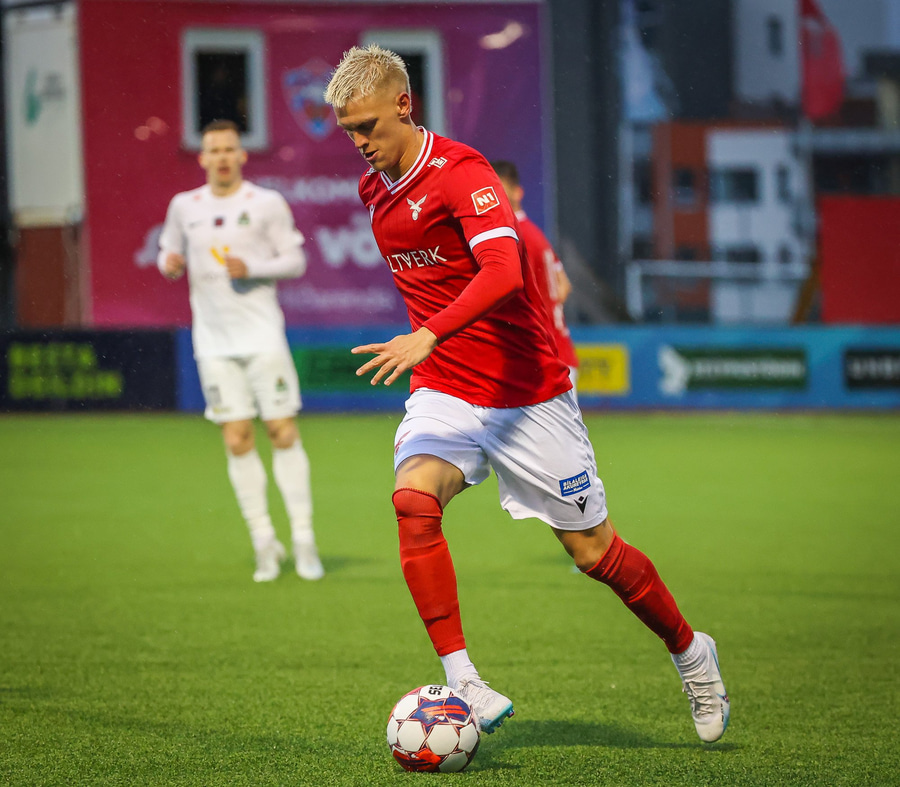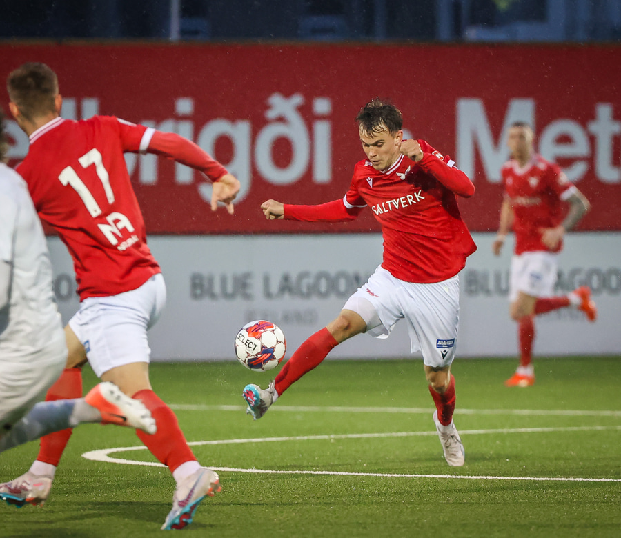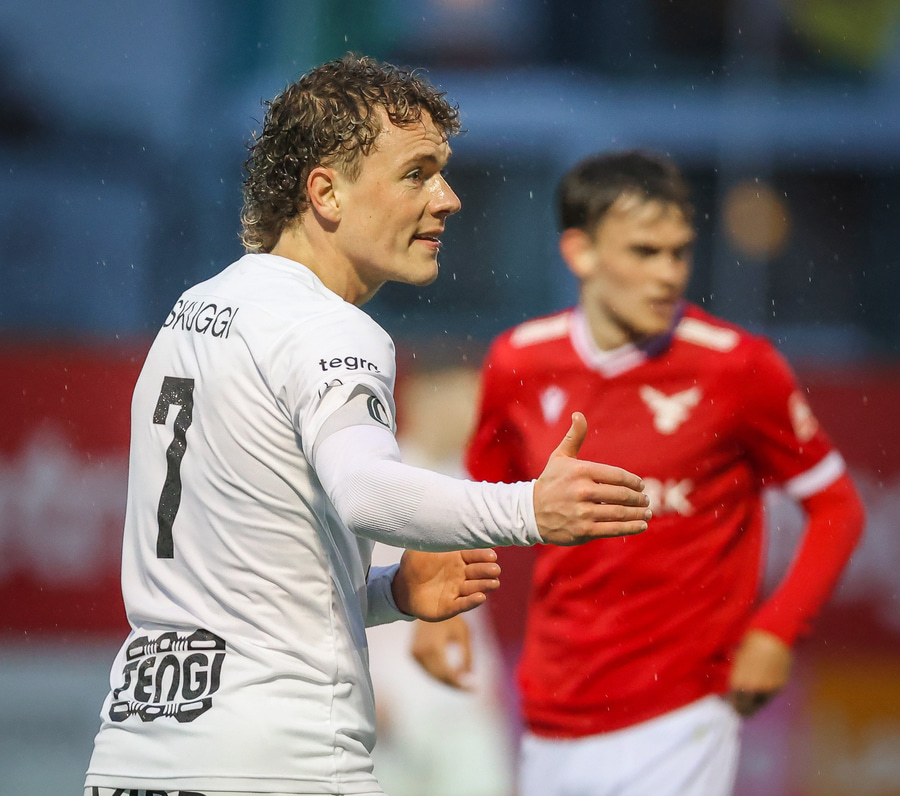Blikar að komast í ágætis stöðu en Patrik Johannesen skóflar boltanum yfir markið.