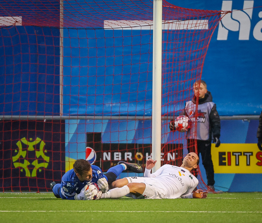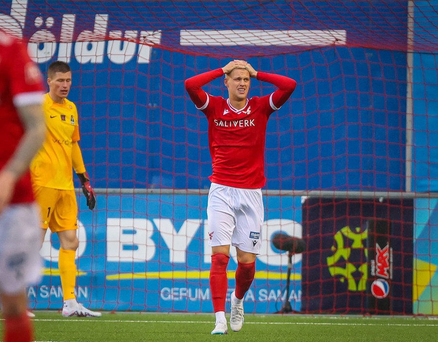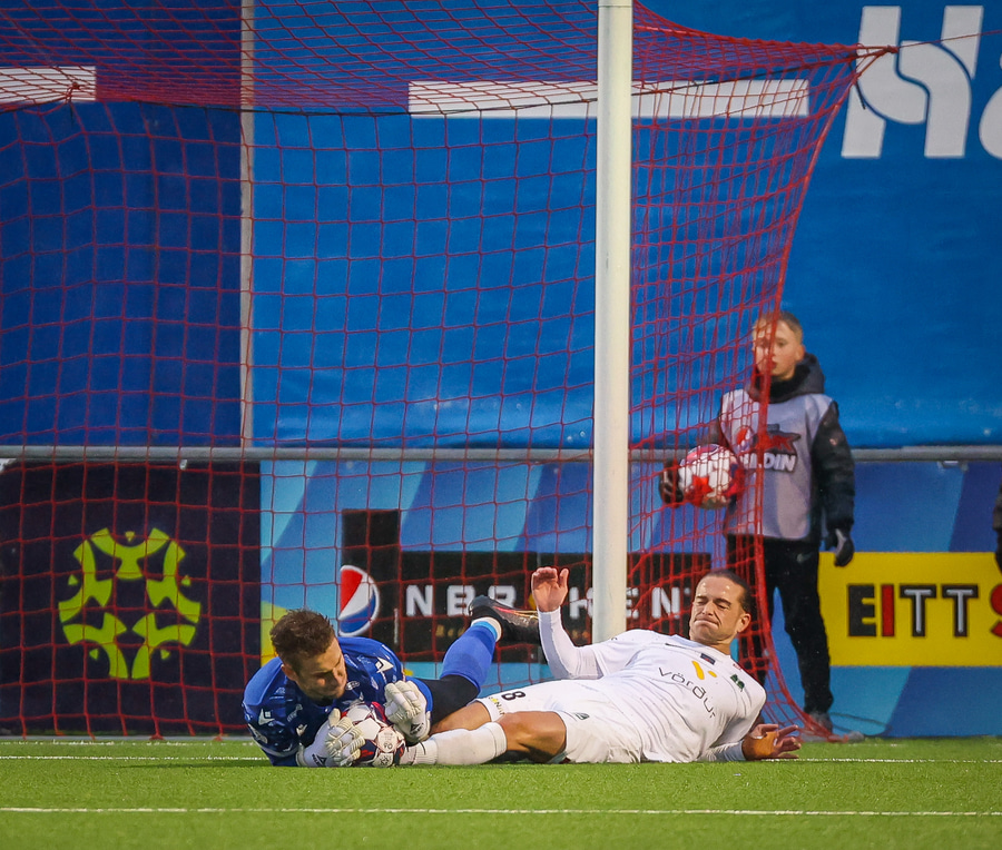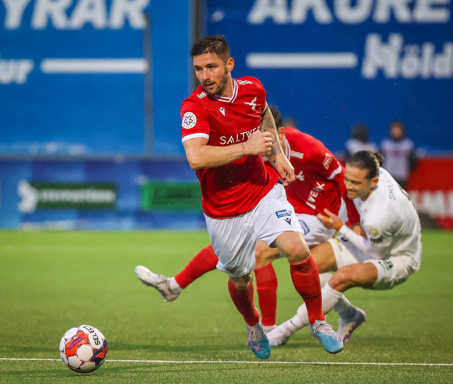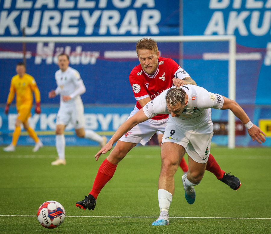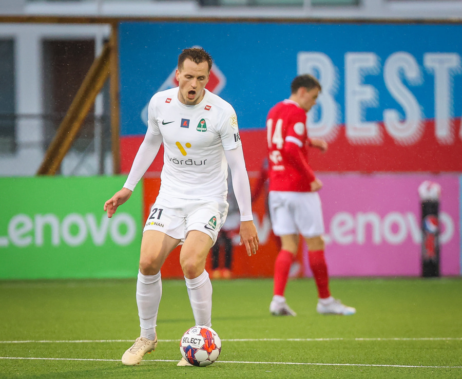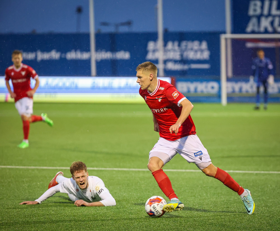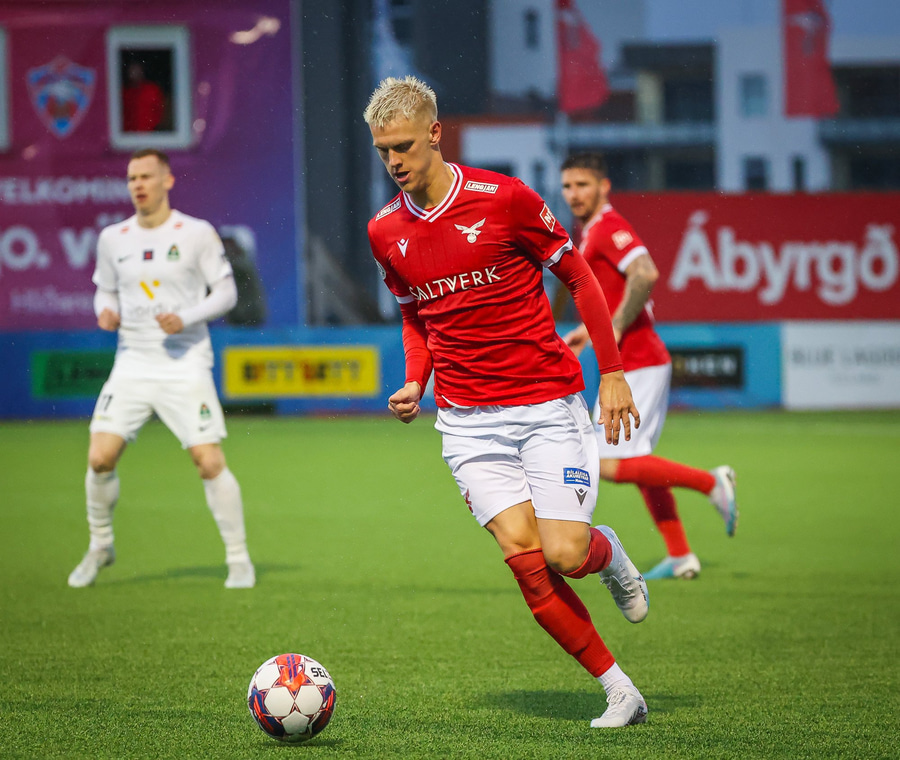 Blikar að komast í ágætis stöðu en Patrik Johannesen skóflar boltanum yfir markið.