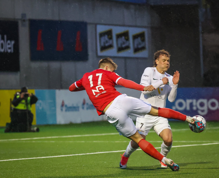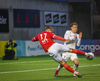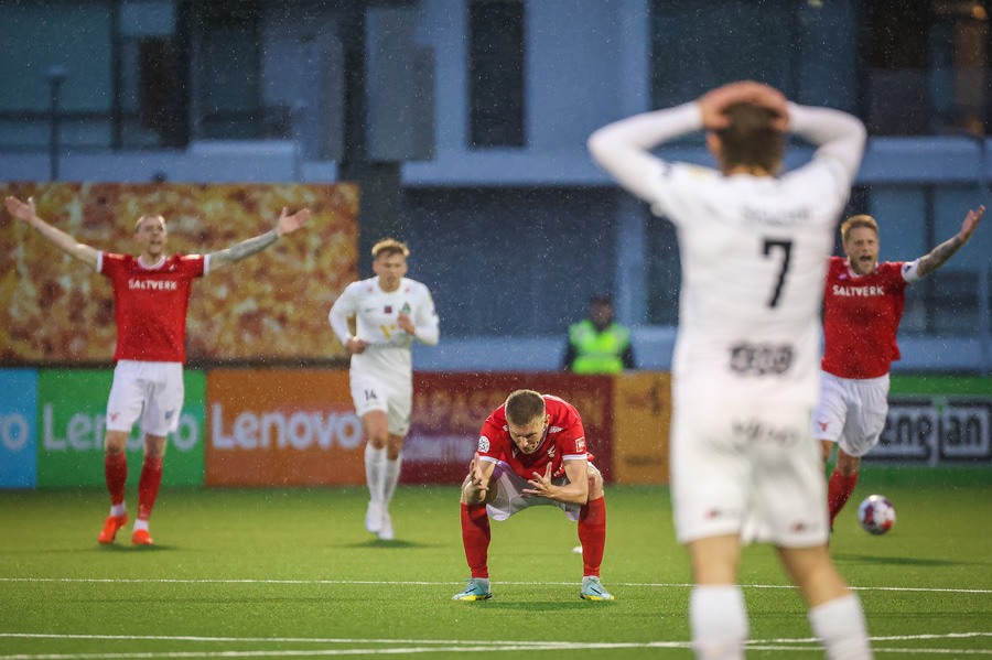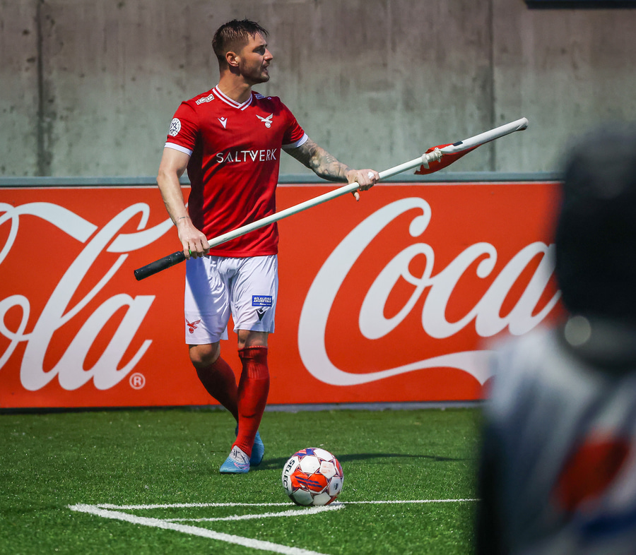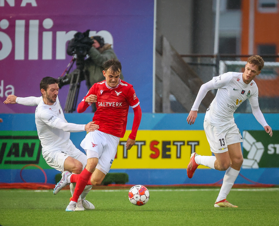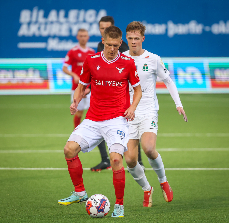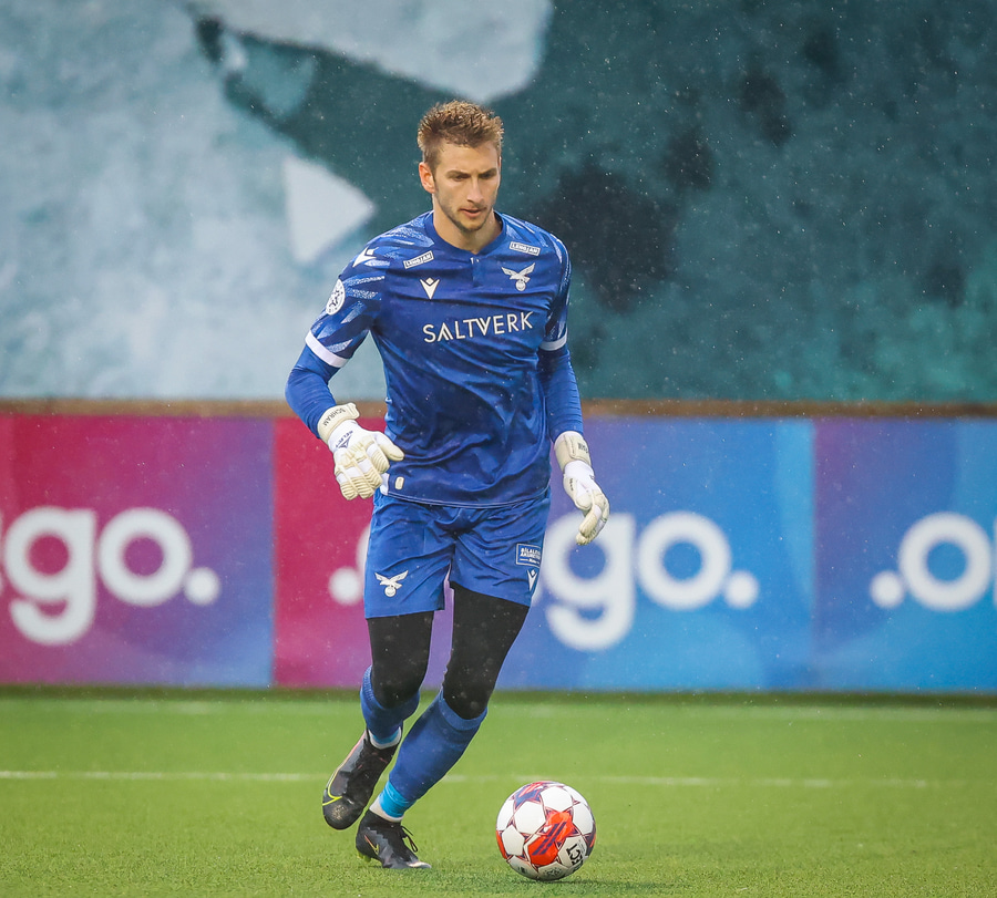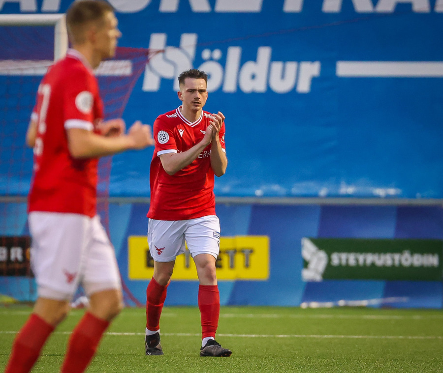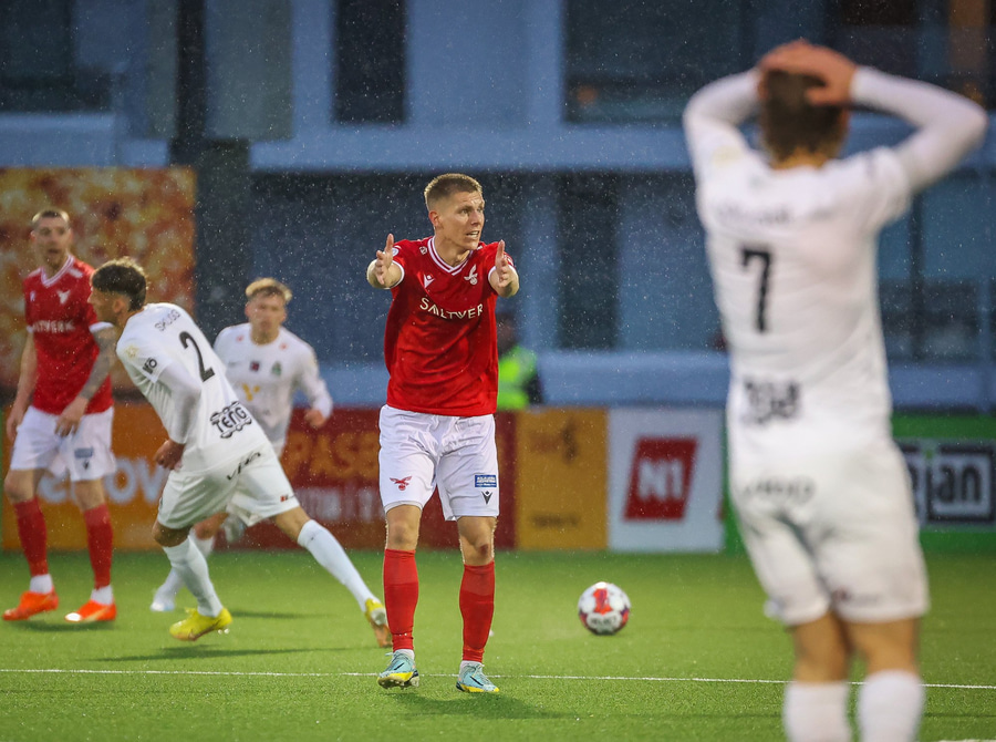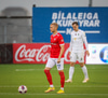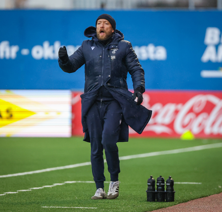Blikar að komast í ágætis stöðu en Patrik Johannesen skóflar boltanum yfir markið.