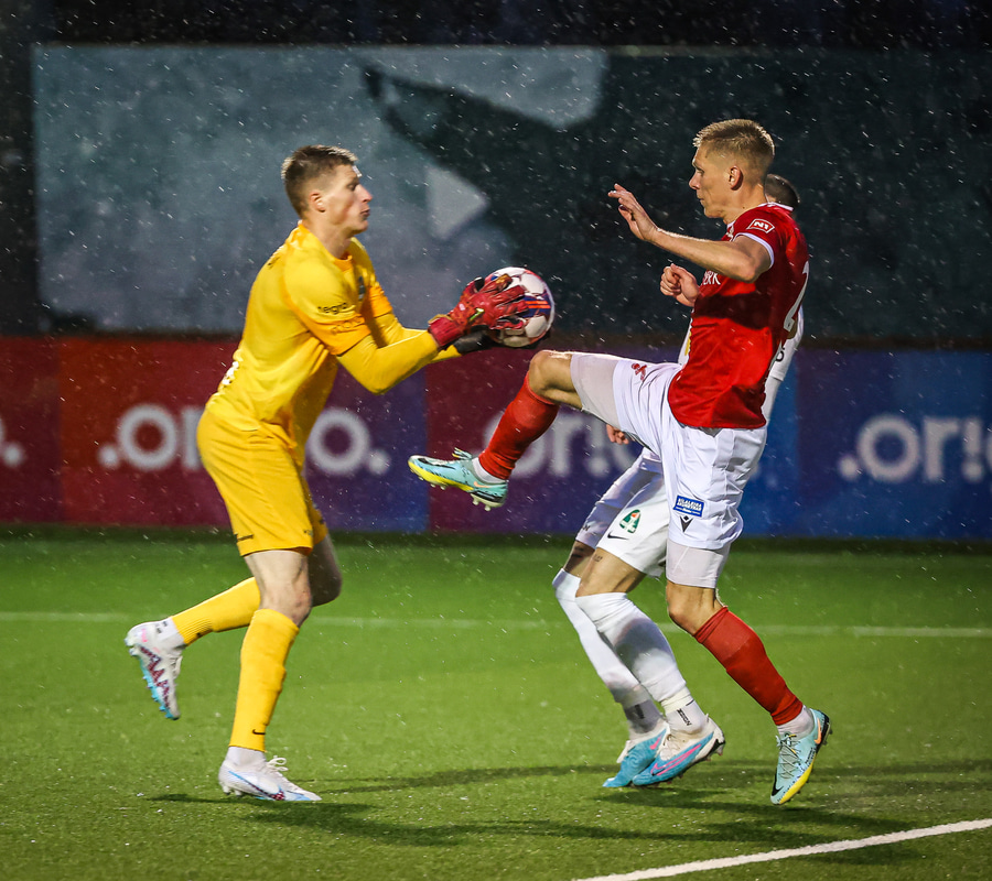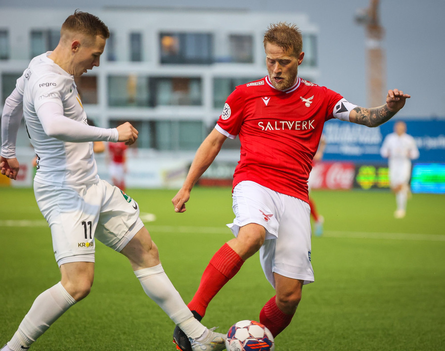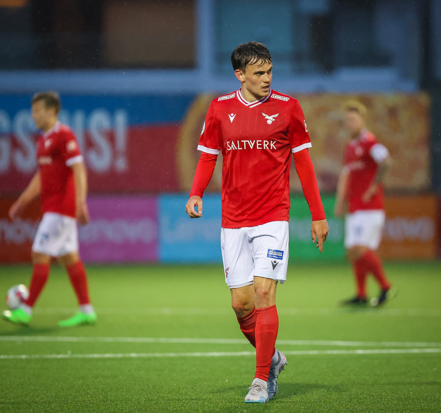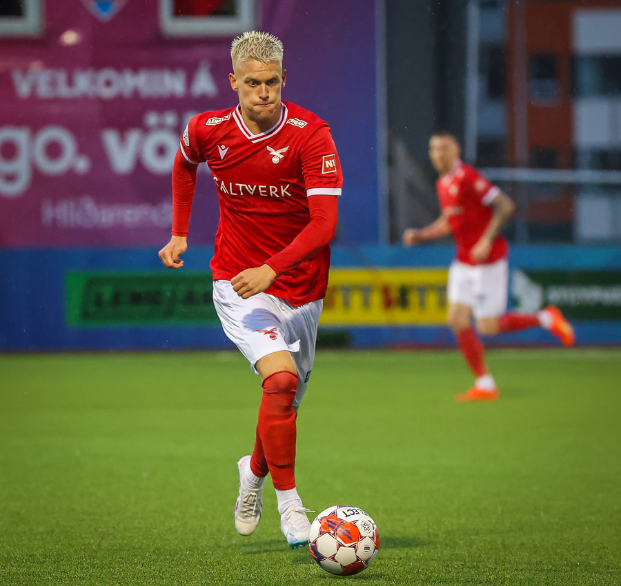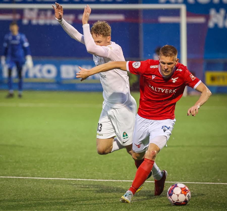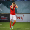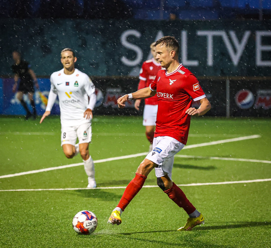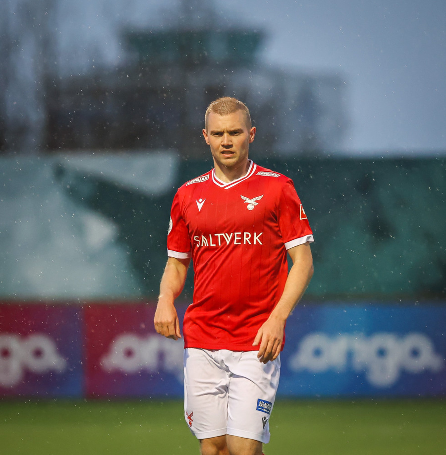 Blikar að komast í ágætis stöðu en Patrik Johannesen skóflar boltanum yfir markið.