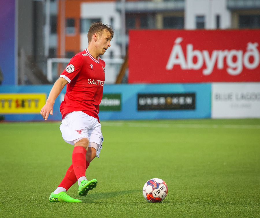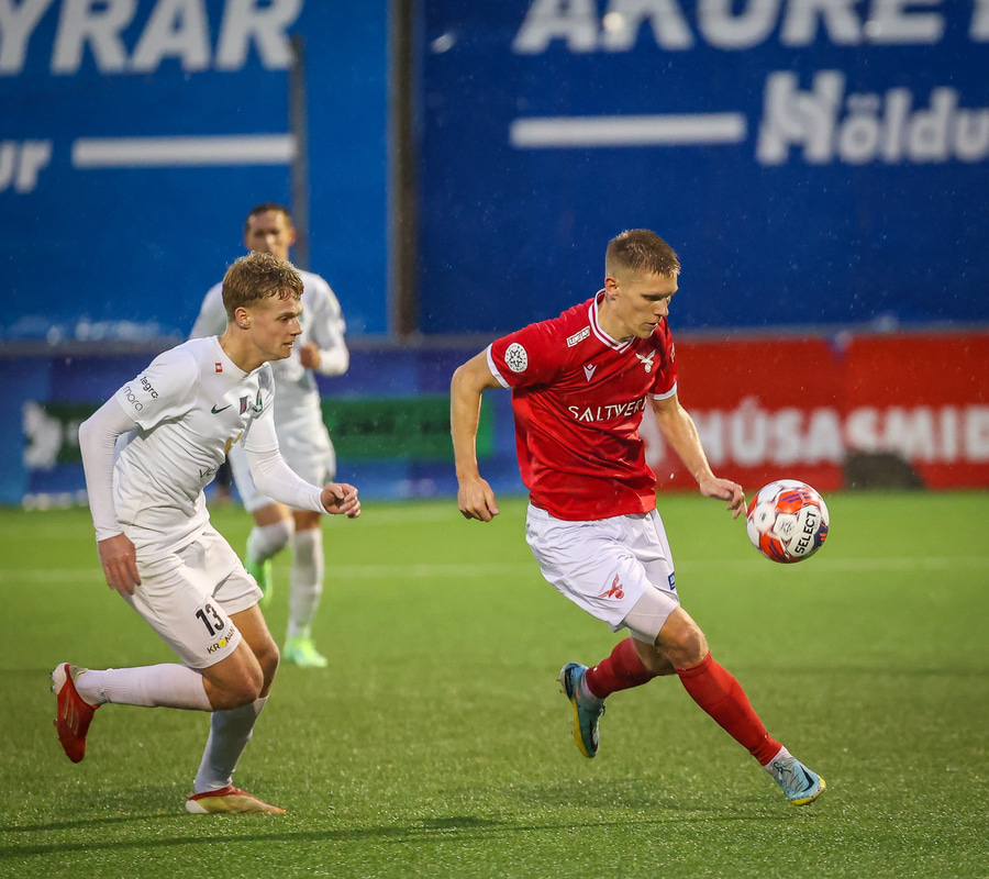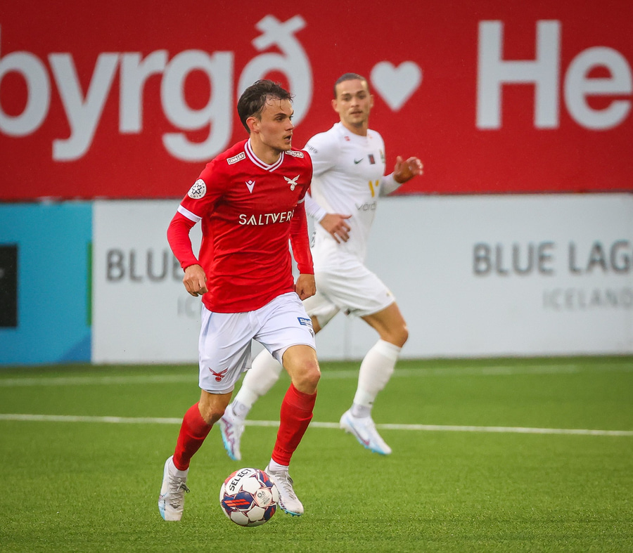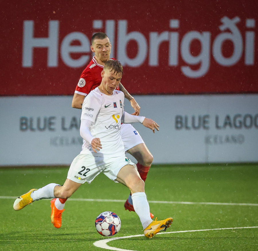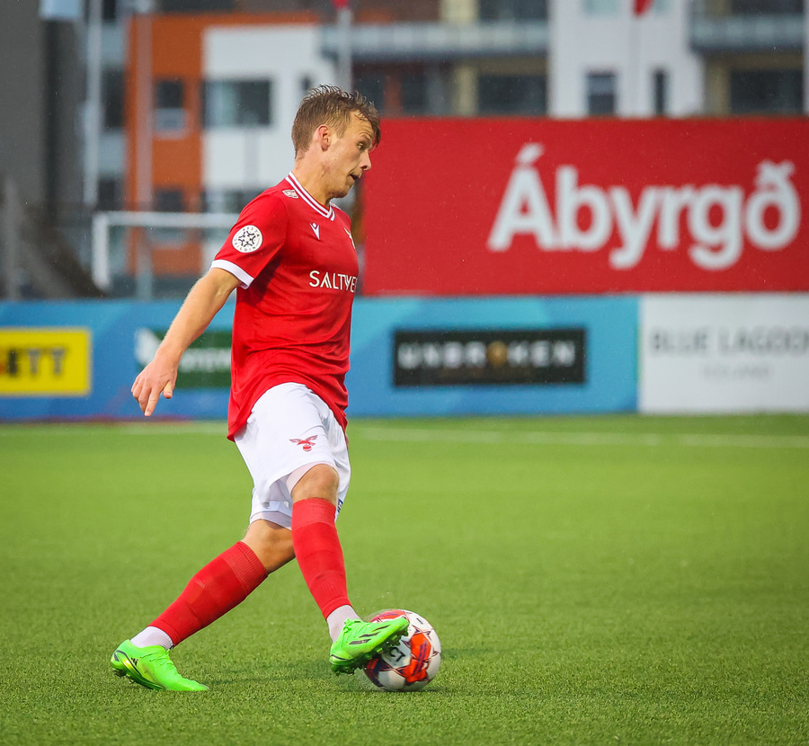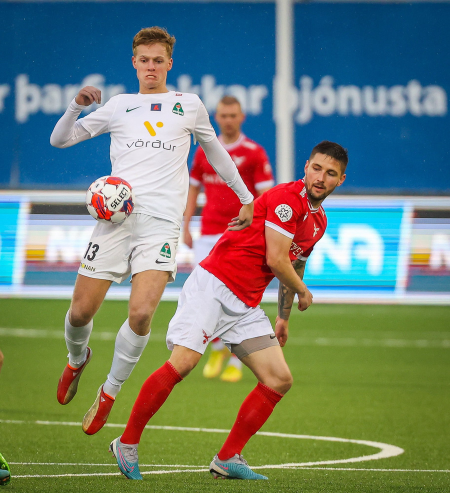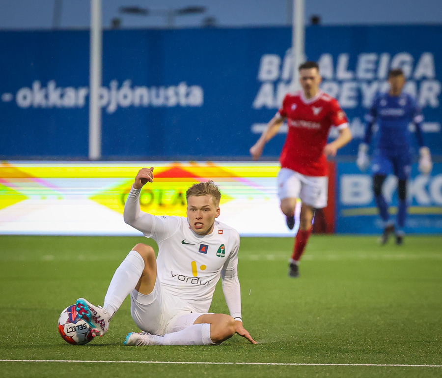 Ágúst Eðvald með frábæran sprett og leggur hann á Viktor Karl sem reynir að koma honum fyrir sig en Frederik nær að stökkva á boltann.