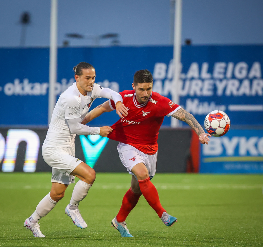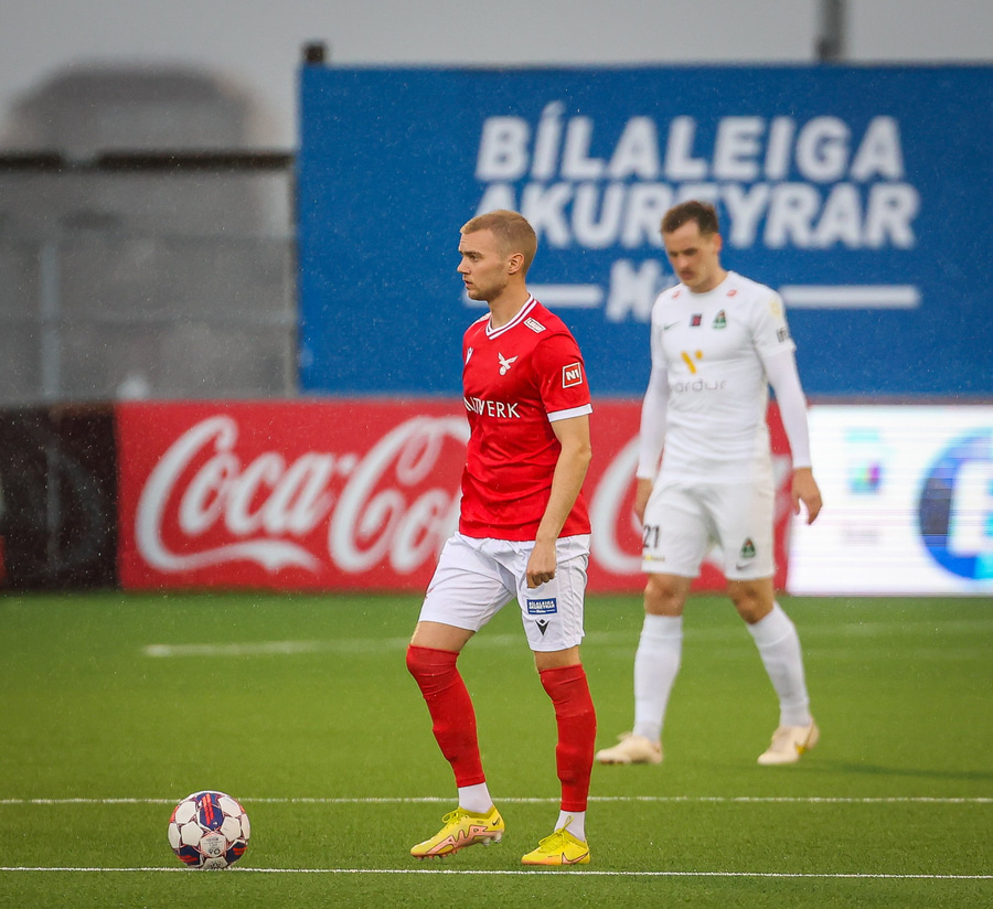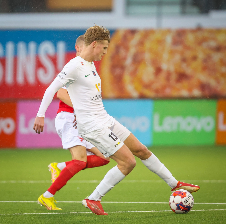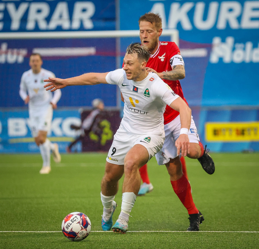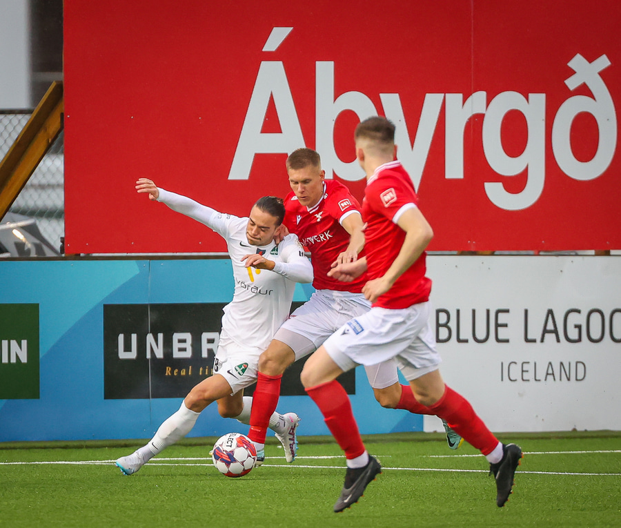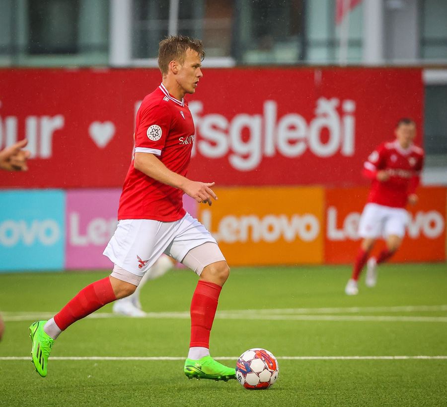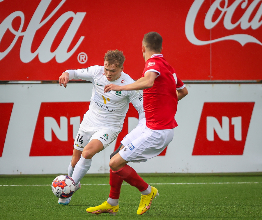 Ágúst Eðvald með frábæran sprett og leggur hann á Viktor Karl sem reynir að koma honum fyrir sig en Frederik nær að stökkva á boltann.