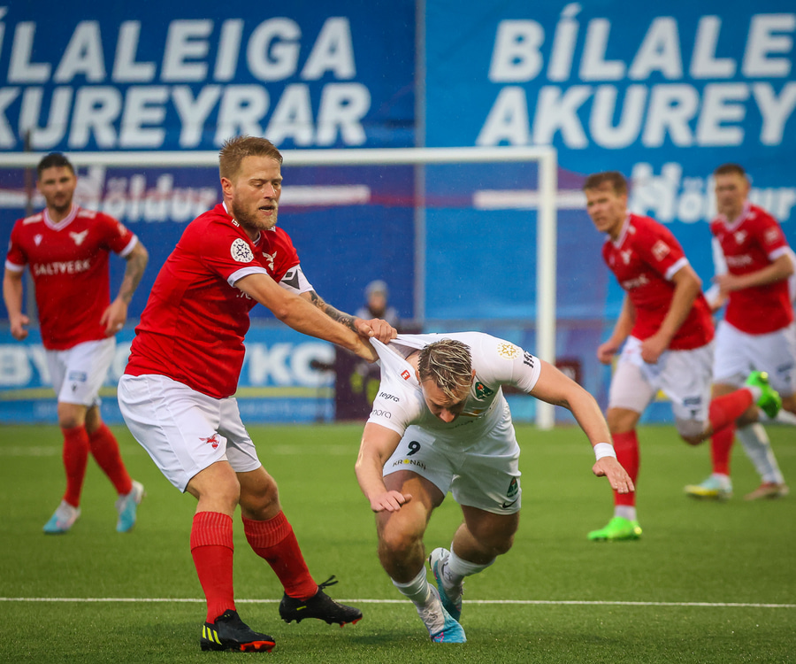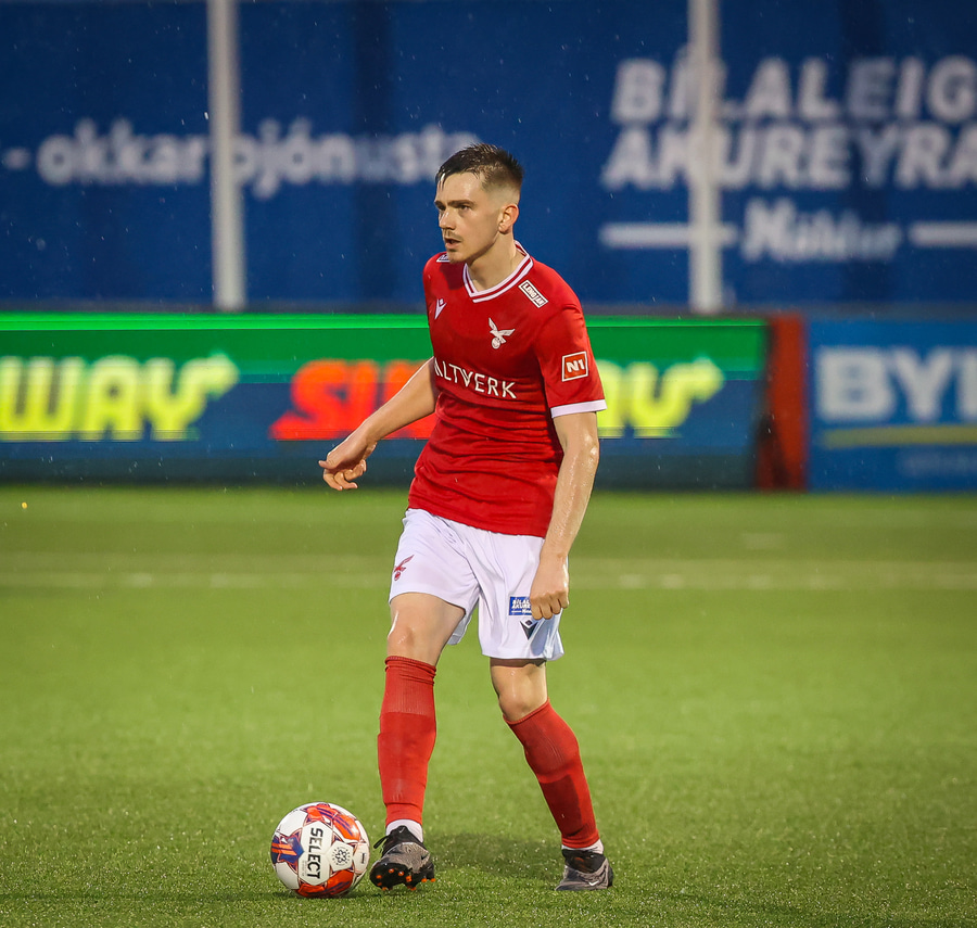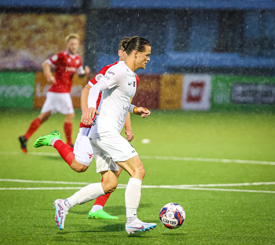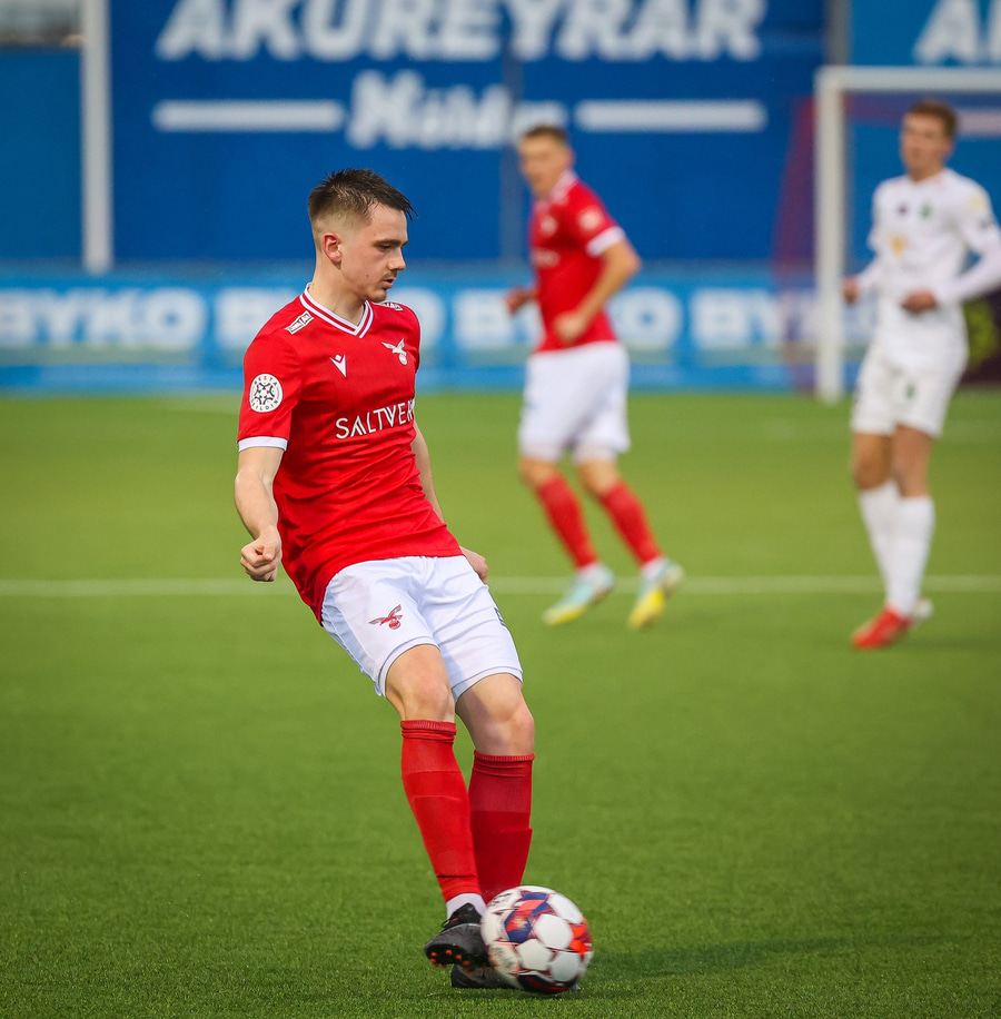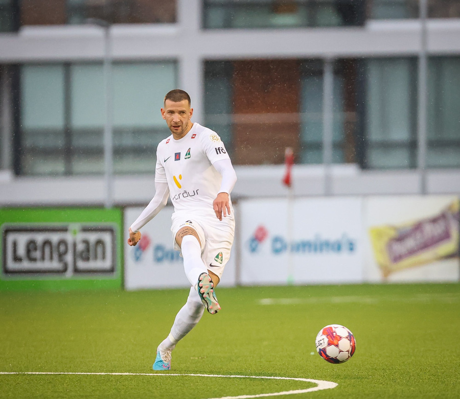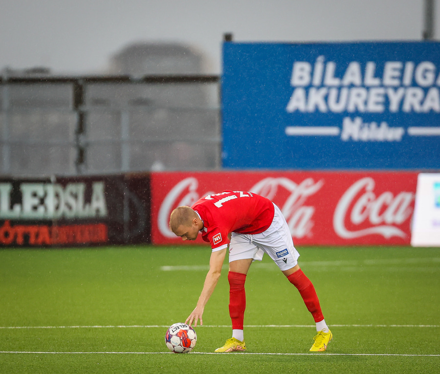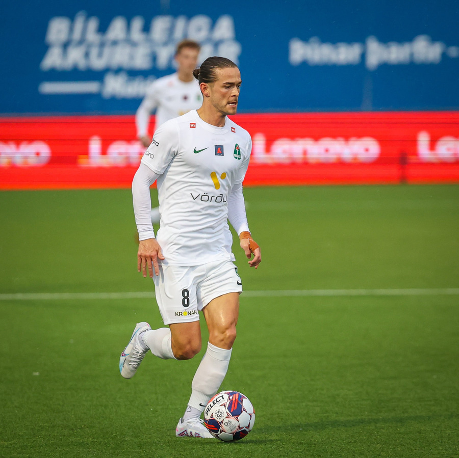 Ágúst Eðvald með frábæran sprett og leggur hann á Viktor Karl sem reynir að koma honum fyrir sig en Frederik nær að stökkva á boltann.