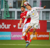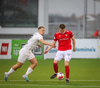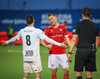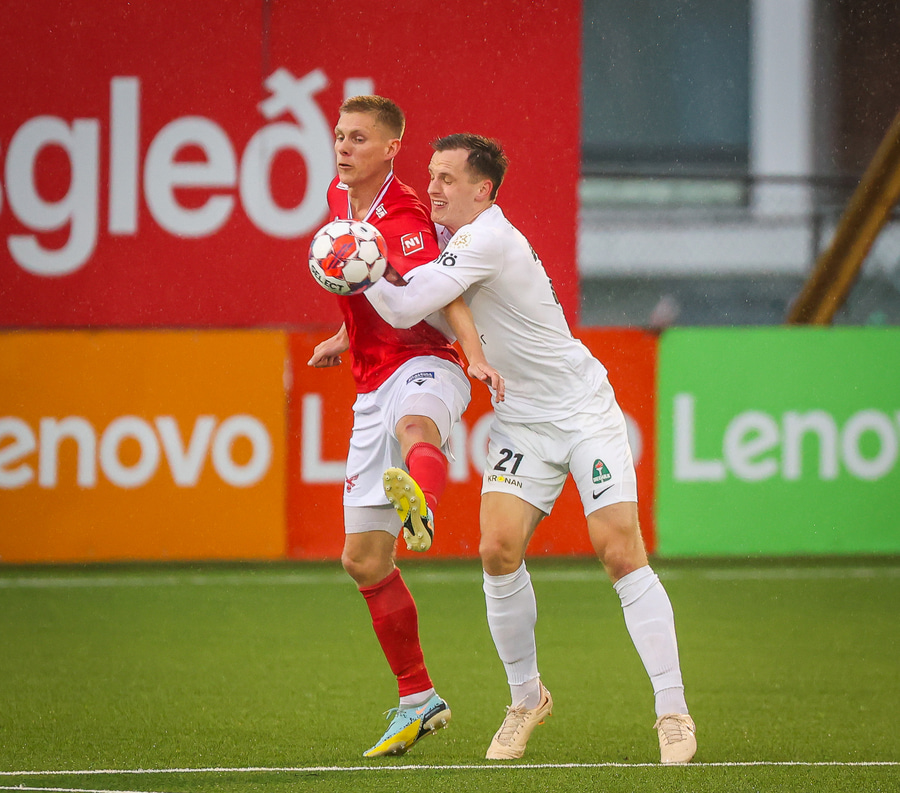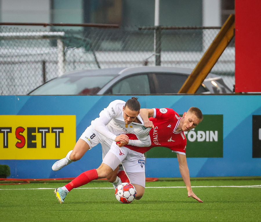 Gefur Patrik Johannesen olnbogaskot í magann og er stálheppin að fá ekki annan lit á spjaldið.