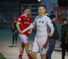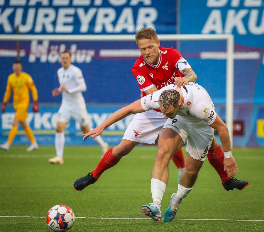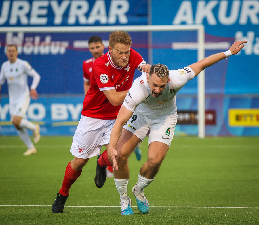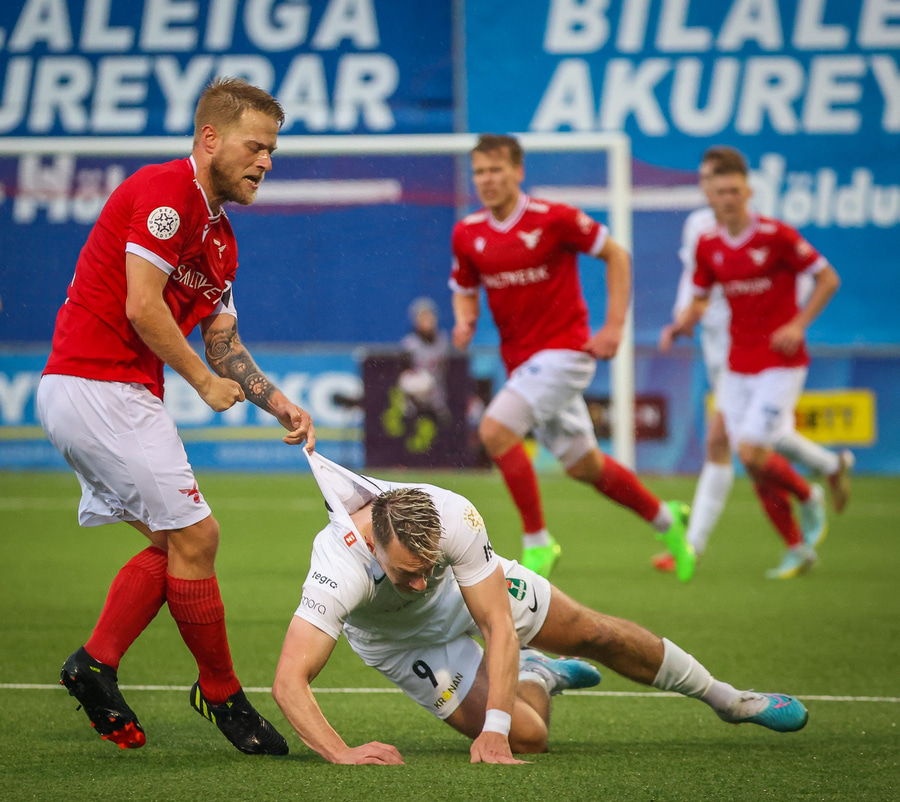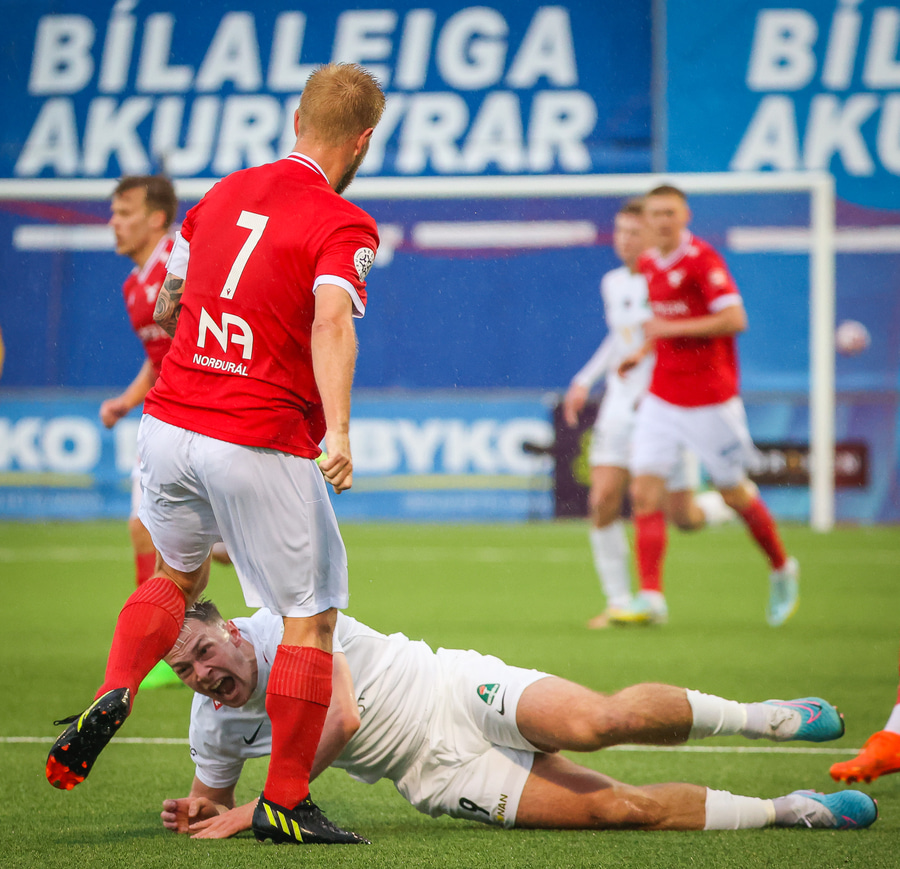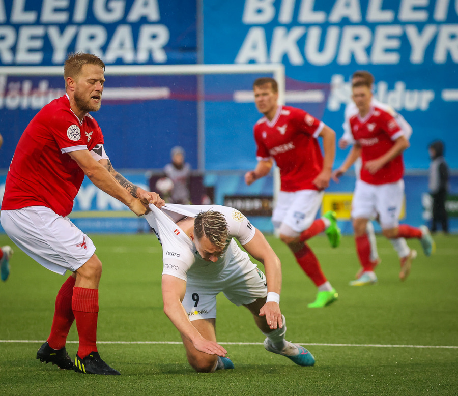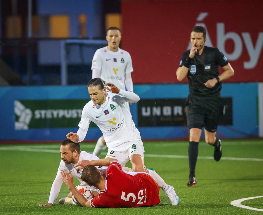 Guðmundur Andri heppin að sleppa með spjald þegar hann sparkar Viktor Örn niður.