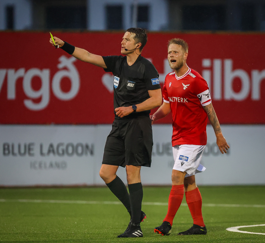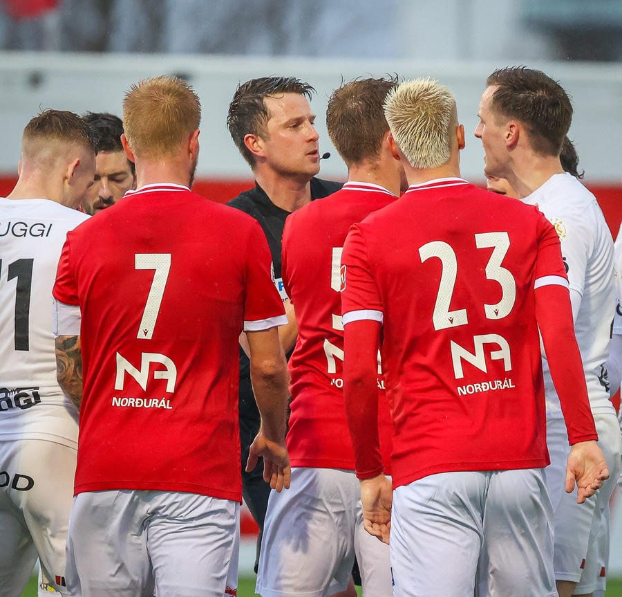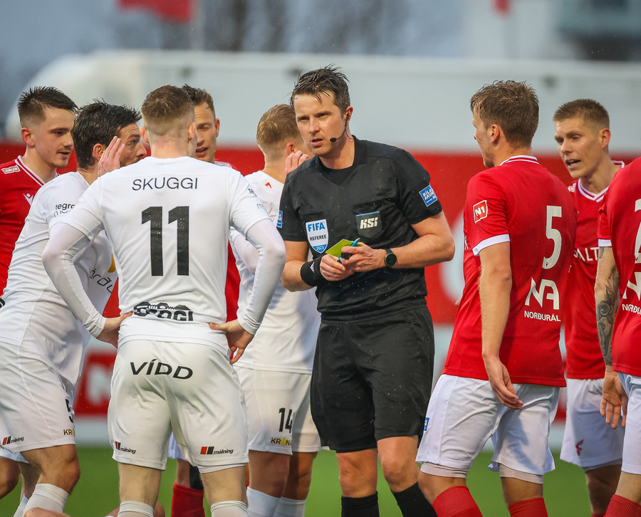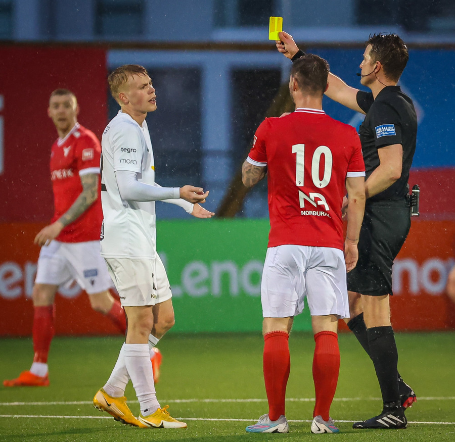 Verið ágætist harka í þessu fyrstu mínúturnar og Vilhjálmur Alvar og co haft nóg að gera þó við bíðum enn eftir fyrsta spjaldinu.