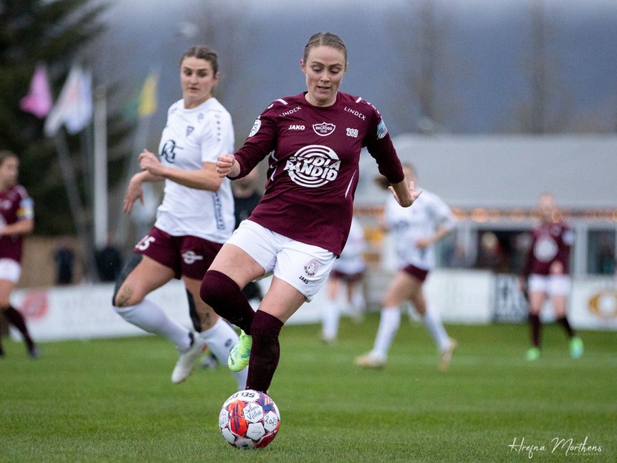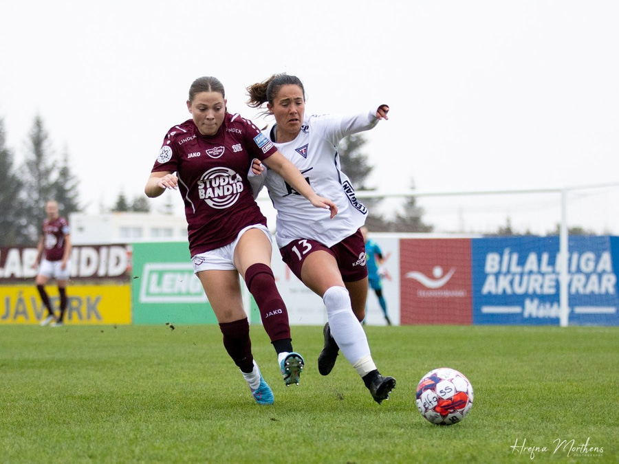 Sif Atla skallar boltann beint í hlaupaleiðina hjá Aldísi Maríu sem lætur vaða en Idun ver vel í marki heimamanna.