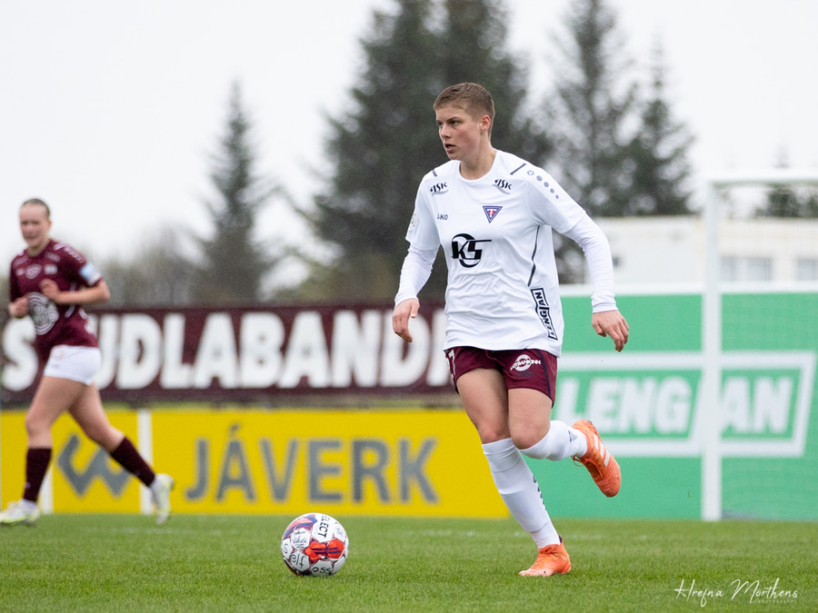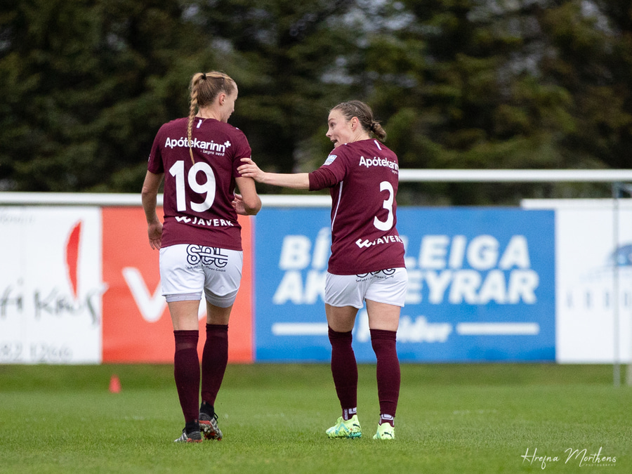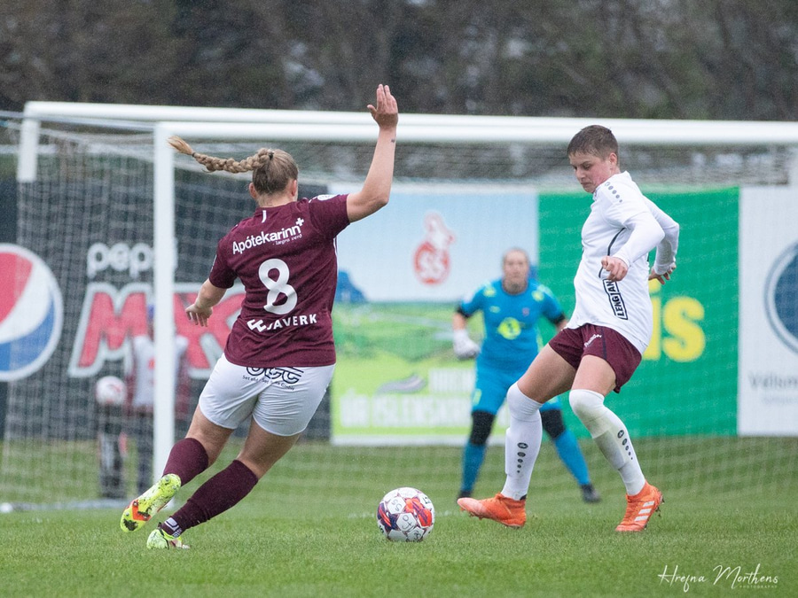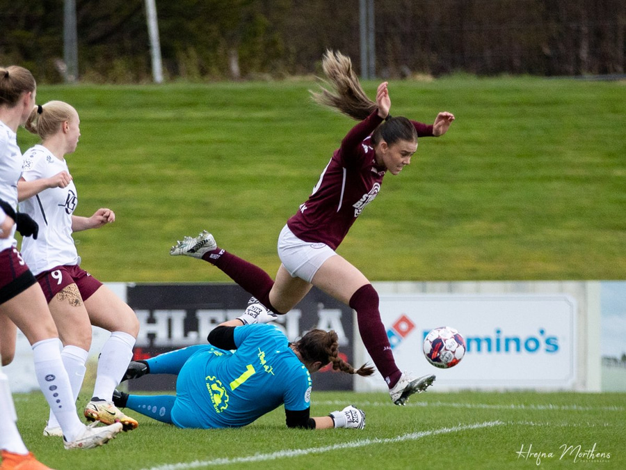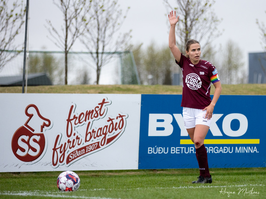 Sif Atla hleypur upp hægri kantinn og kemur með fyrirgjöf á Guðrúnu Þóru sem skallar boltann í varnarmann hann fer aftur fyrir endalínu í horn.