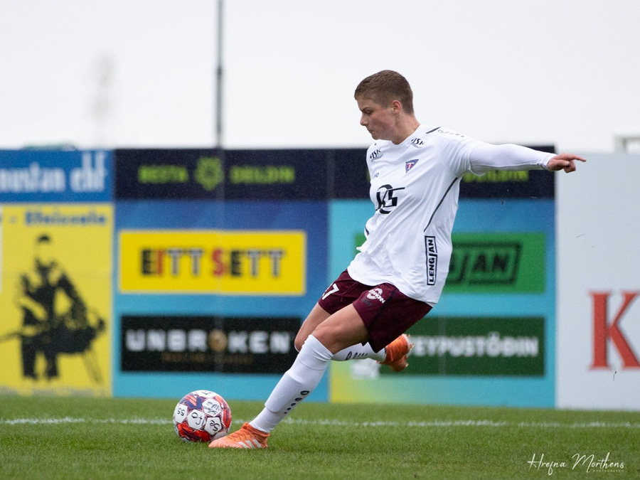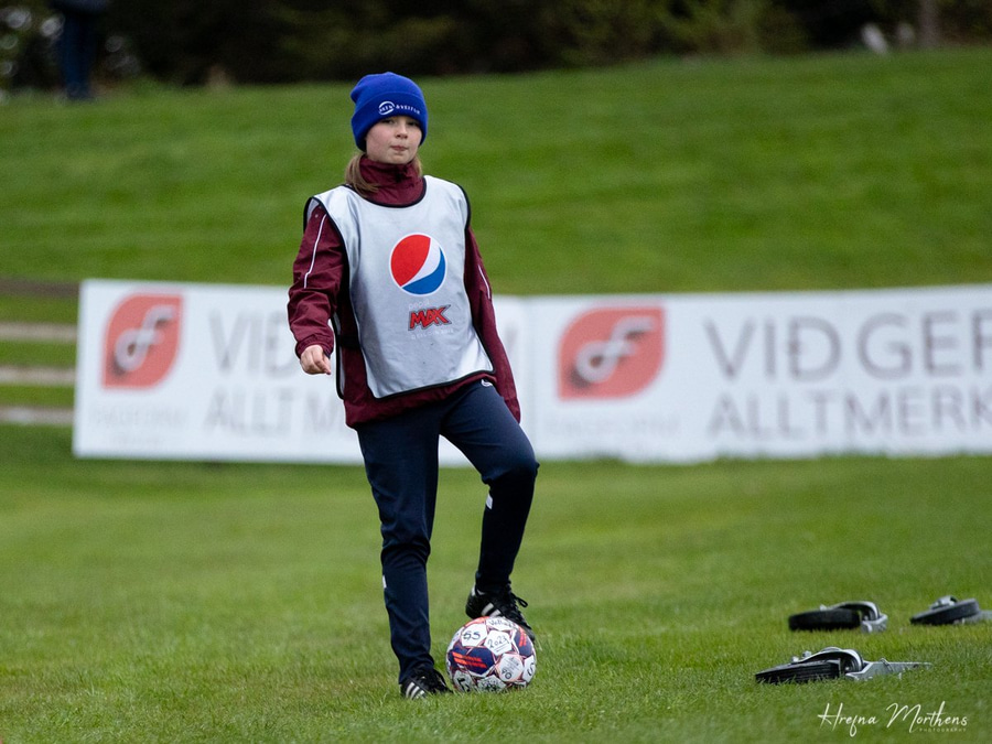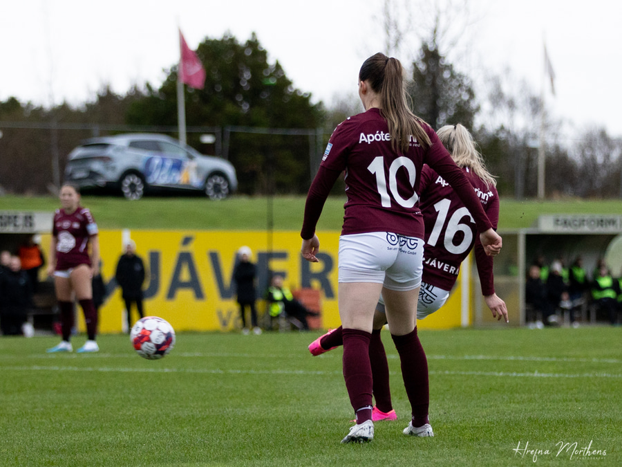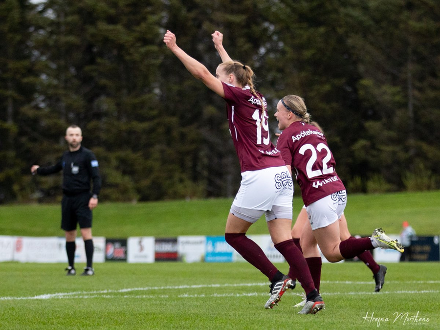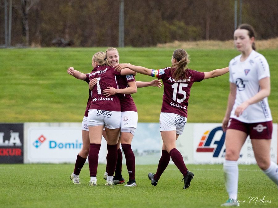 Sif Atla hleypur upp hægri kantinn og kemur með fyrirgjöf á Guðrúnu Þóru sem skallar boltann í varnarmann hann fer aftur fyrir endalínu í horn.