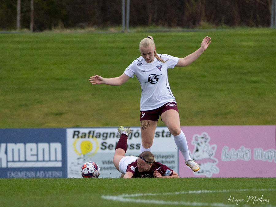 Katla María fer í mjög harkalega tæklingu á Maríu Dögg og fær gult spjald að launum.