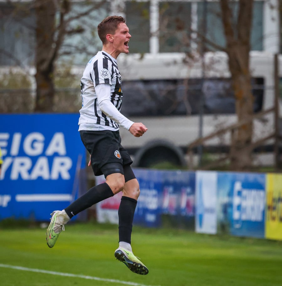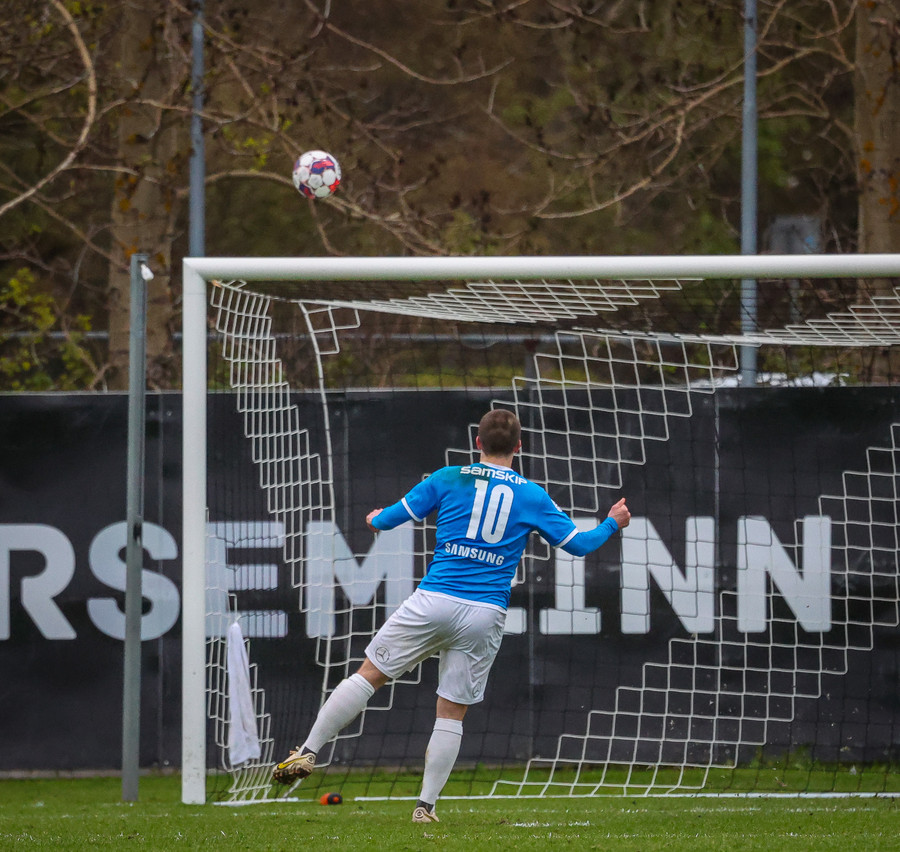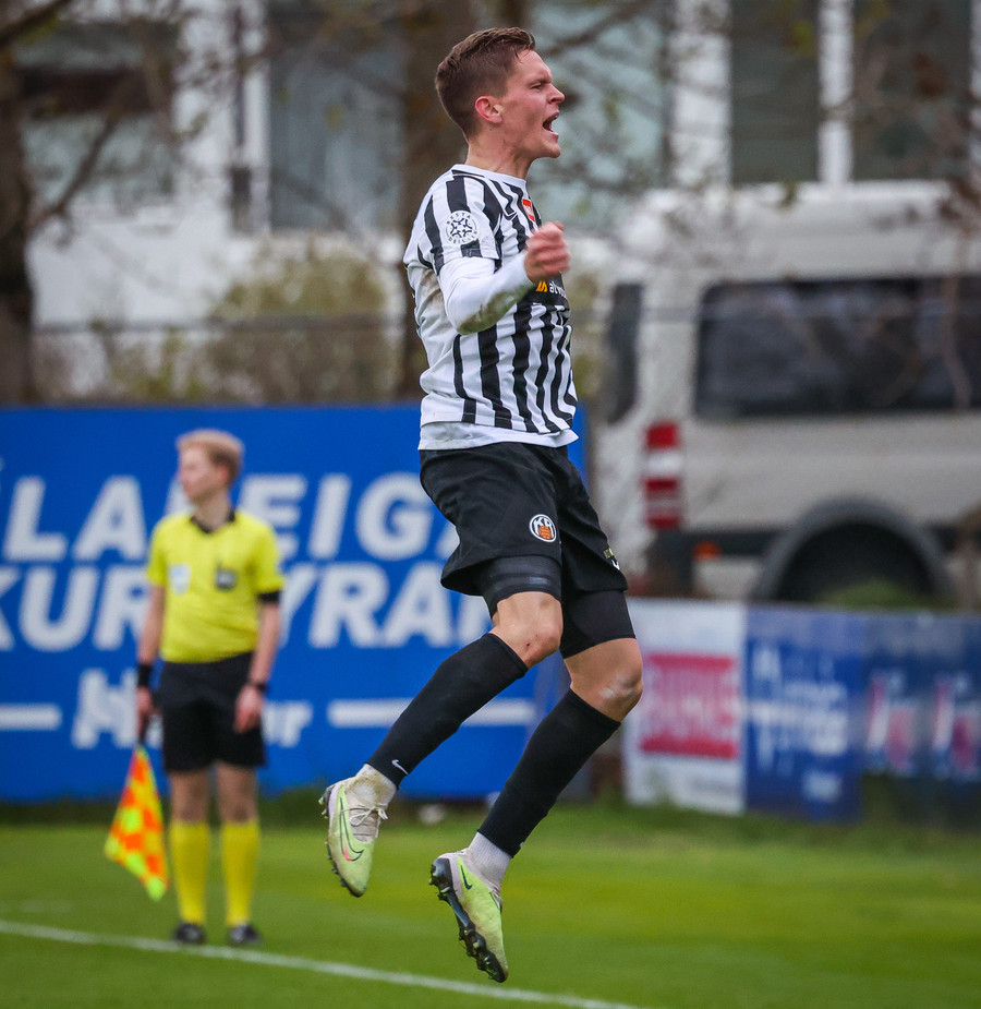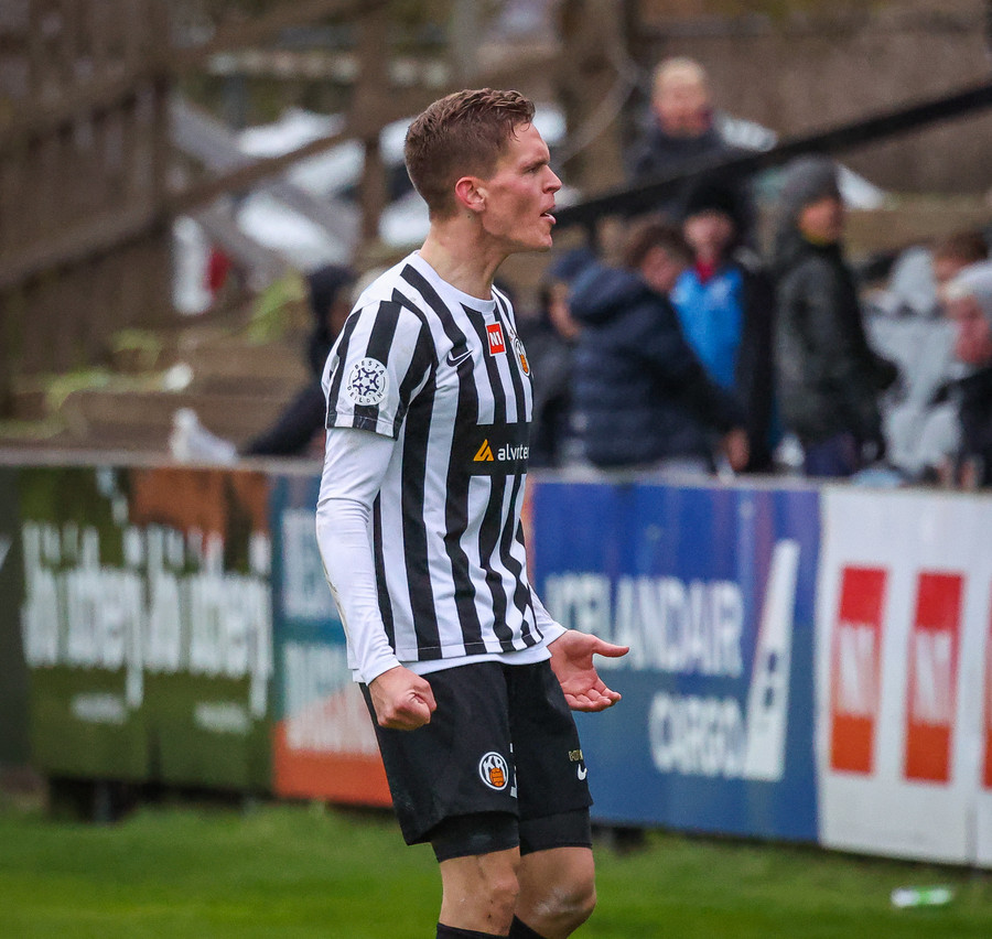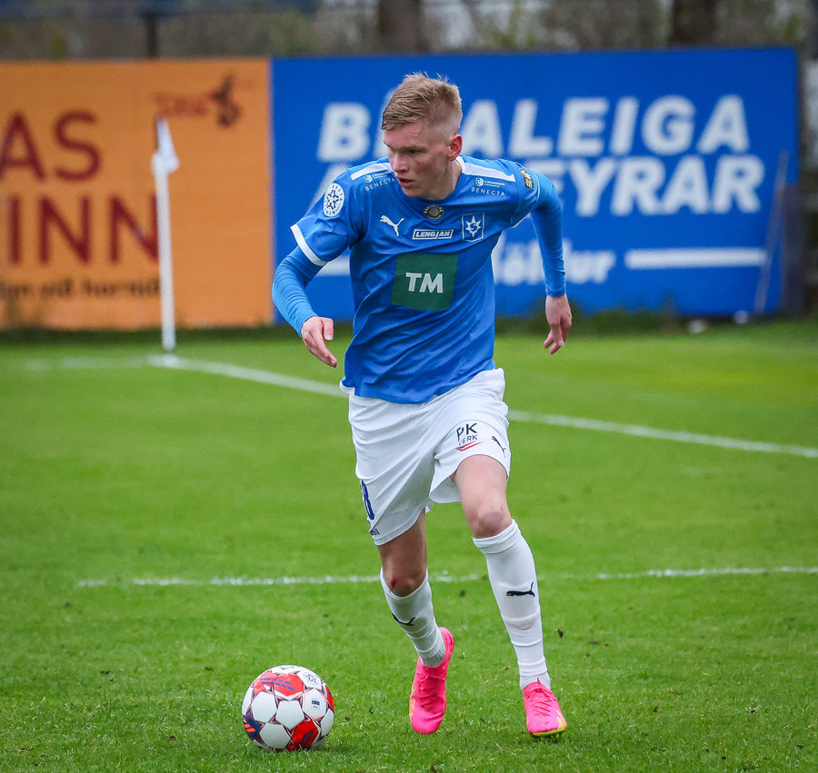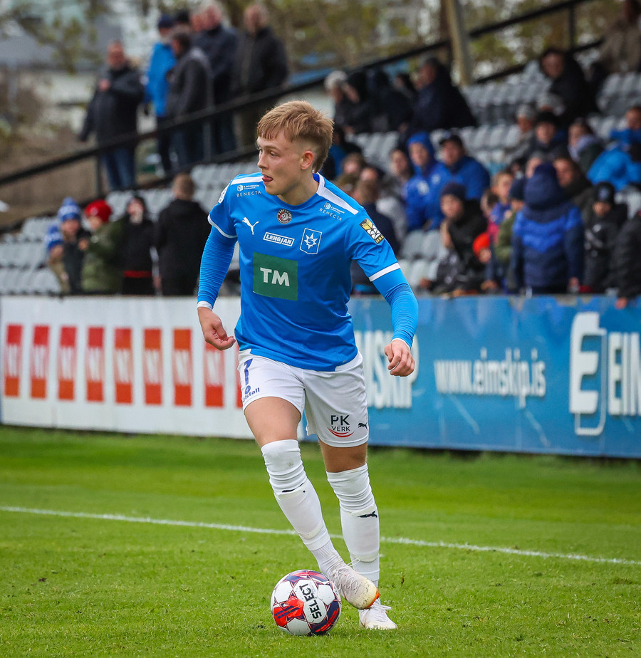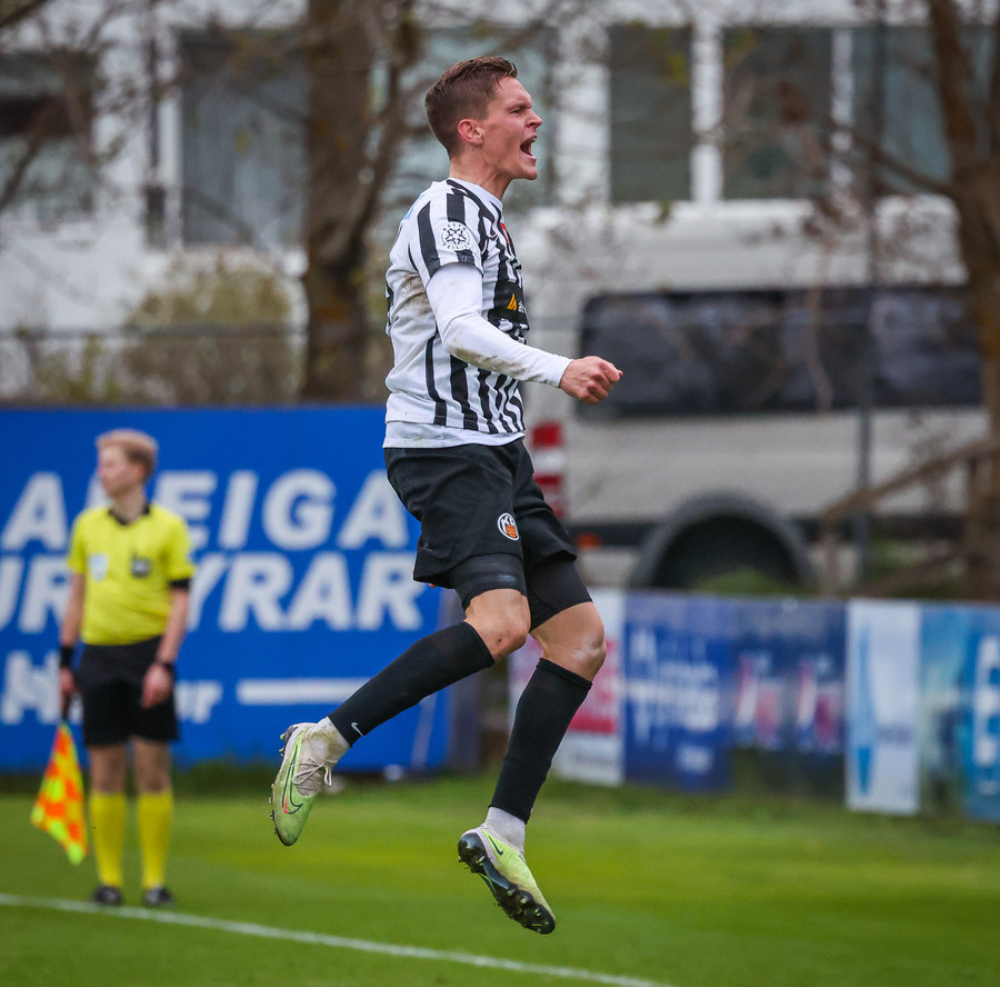Fær boltann frá Benoný, fer framhjá Björn Berg og lætur vaða utarlega úr teignum. Skotið með vinstri fæti í fjærhornið.