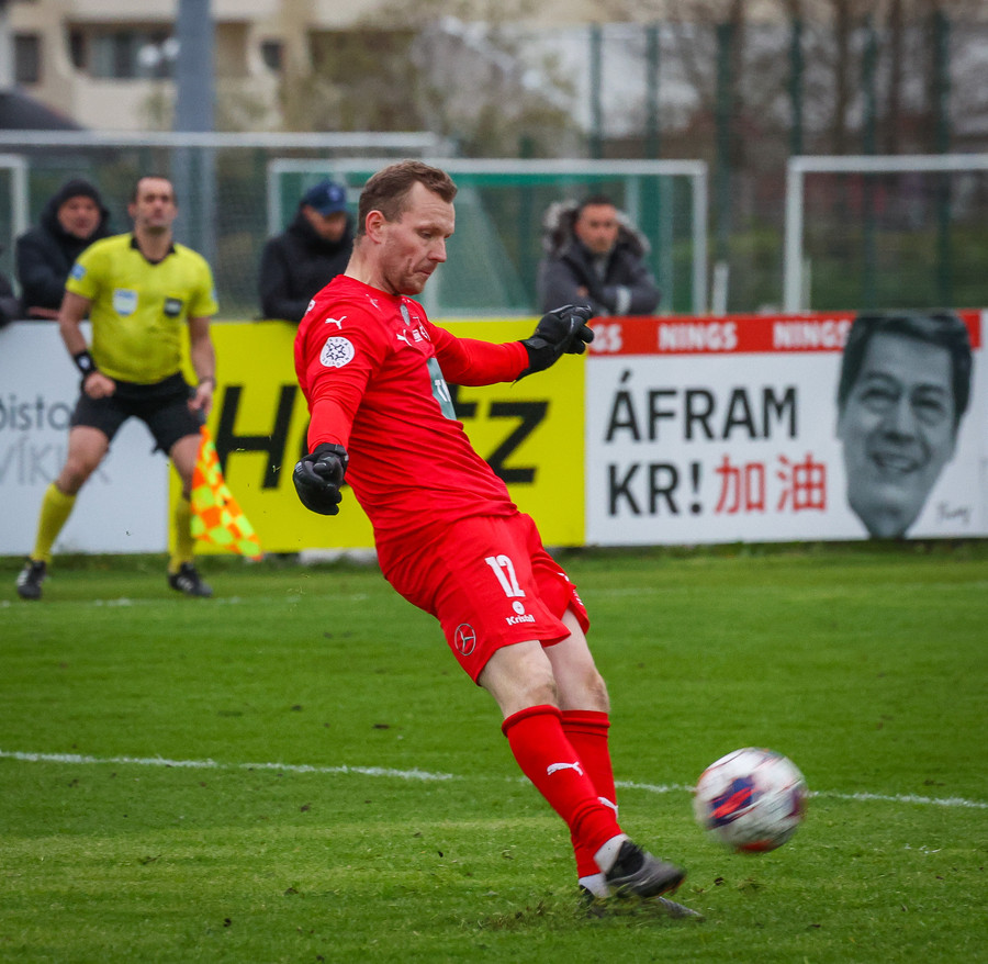 KR á horn. Atli tekur spyrnuna og Árni Snær handsamar boltann.