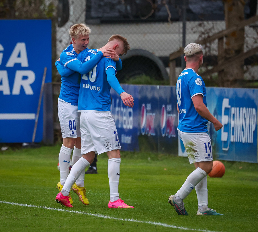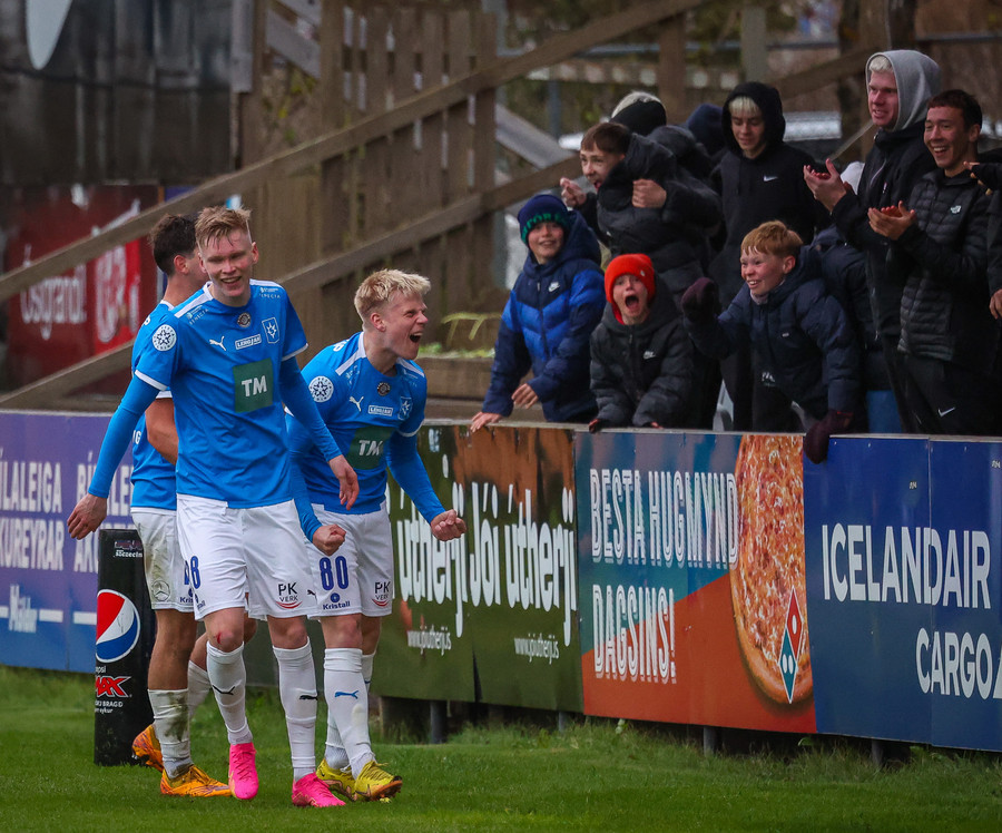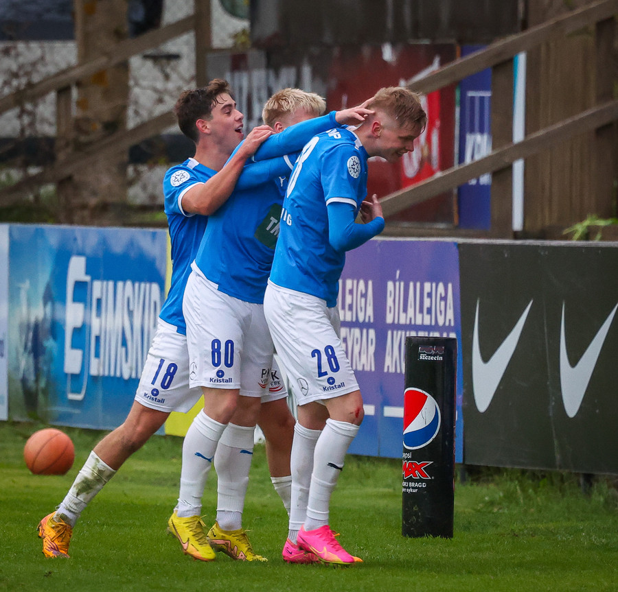 Hornspyrna tekin stutt, boltinn frá Róberti Frosta á Baldur Loga sem á skot sem fer í stöngina, í hina stöngina og svo inn.