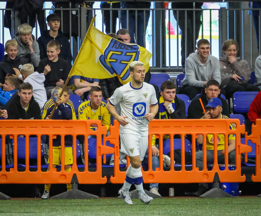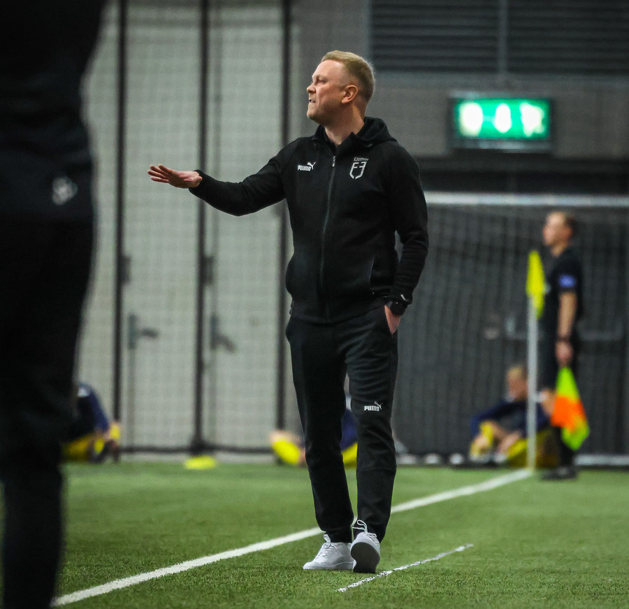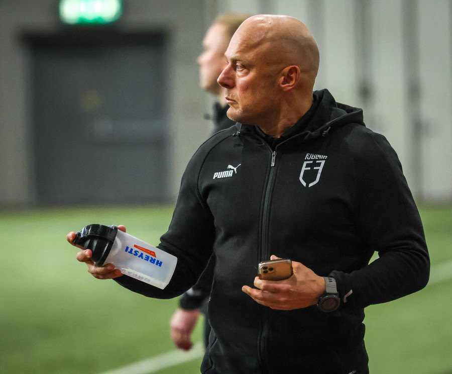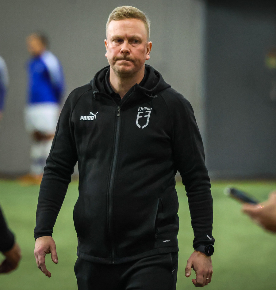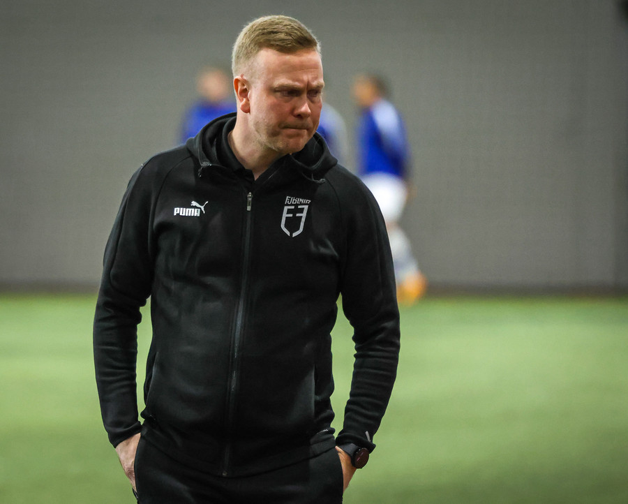Tíðindamiklar mínútur hjá Axel Frey núna. Eftir sókn Fjölnis á Reynir fyrirgjöf sem endar hjá Axel sem hamrar boltanum í netið úr teignum