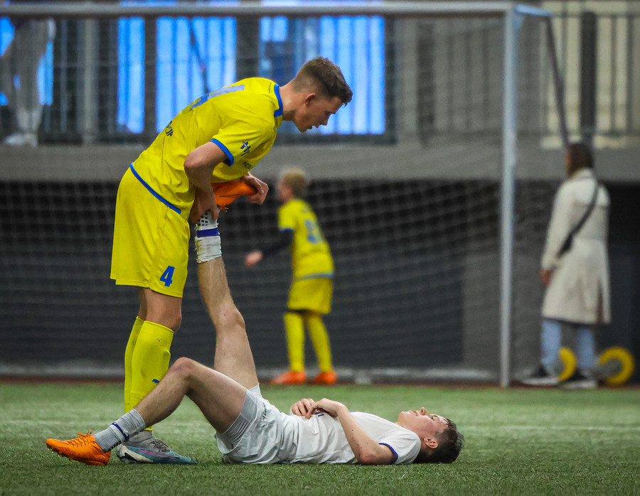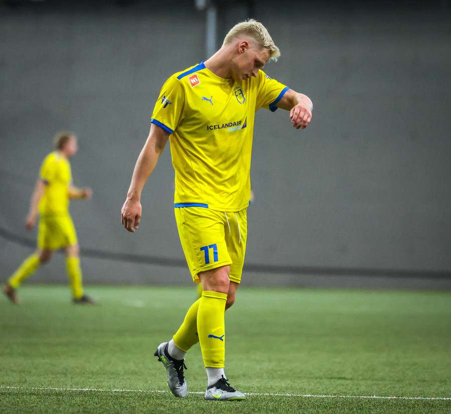 Fyrsta skipting leiksins. Sigurður Steinar settist í grasið og gaf strax til kynna að hann gæti ekki haldið leik áfram. Patrik Orri Pétursson kemur inn á