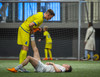 Tómas Jóhannesen í Gróttu liggur eftir viðskipti við Sigurvin Reynisson þegar dómarinn sá ekki til. Aftur að myndast hiti