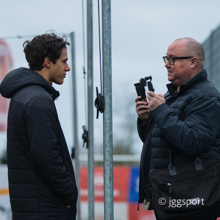 Gummi Magg með skemmtilega heimsókn í fréttamannastúkuna. Náði sér í kaffibolla til að fá smá hlýju í bekkjarsetuna.