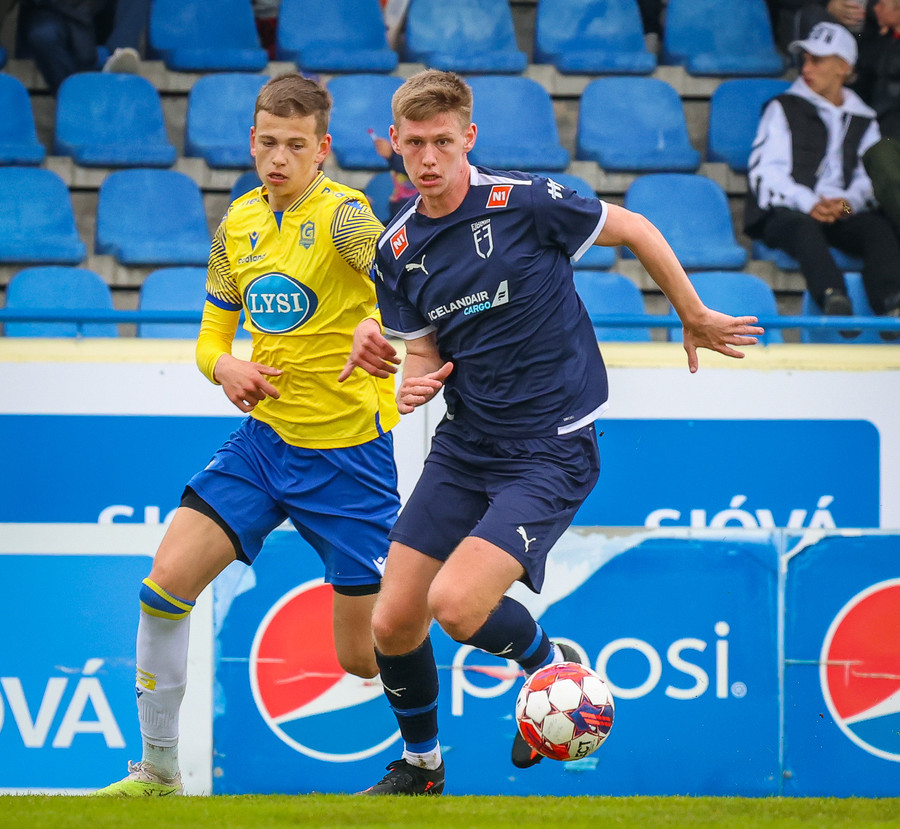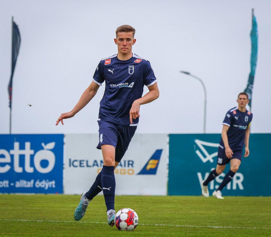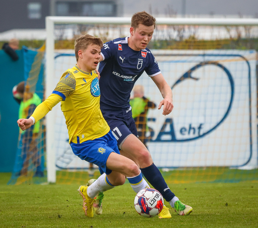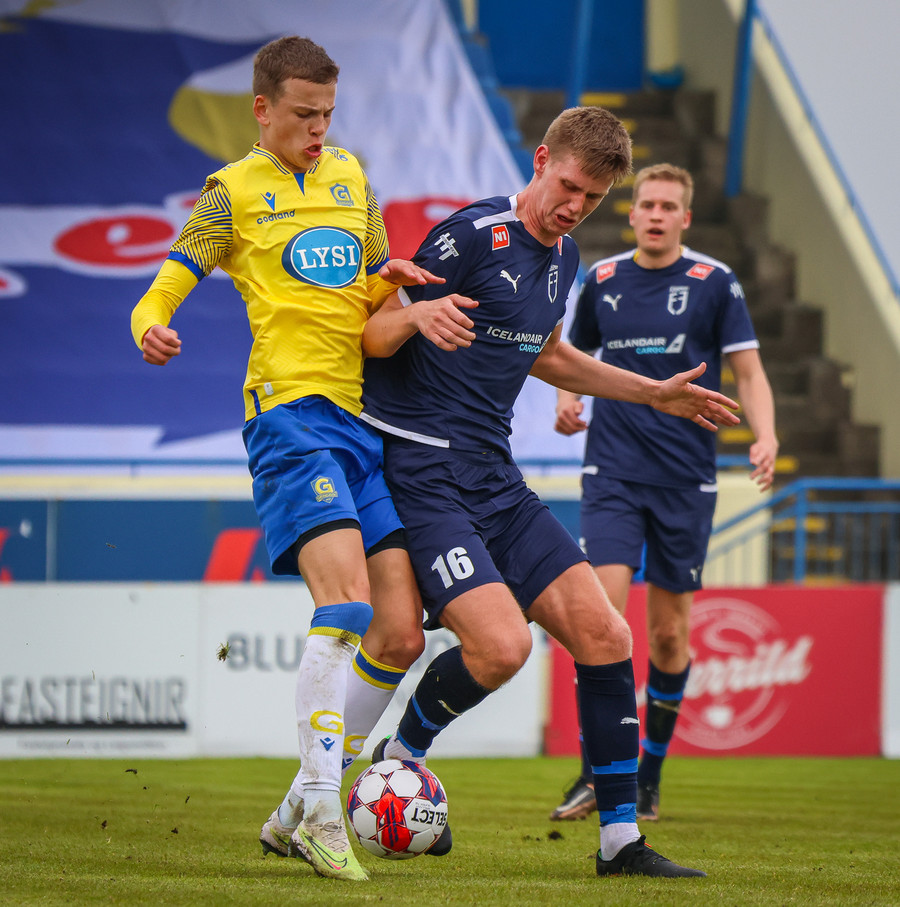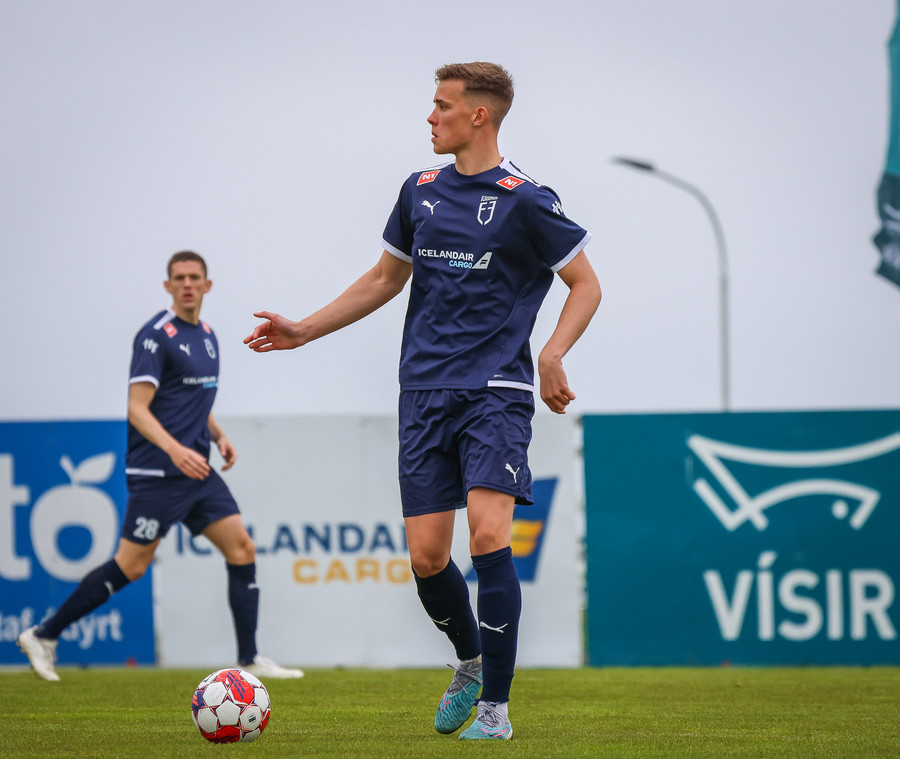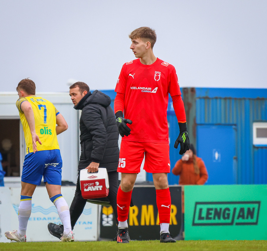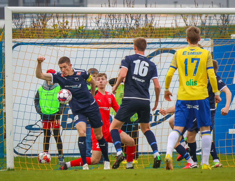 Dofri Snorrason með boltann úti til hægri á frábæra sendingu í svæðið milli varnar og markmanns. Þar rennir Hákon sér í boltann, Aron Dagur frosinn á línunni en lukkan er með honum. Boltinn í stöngina og þaðan í fang Arons.