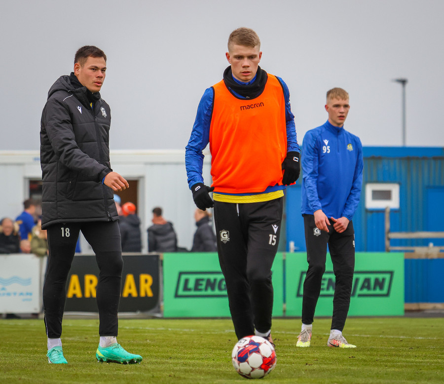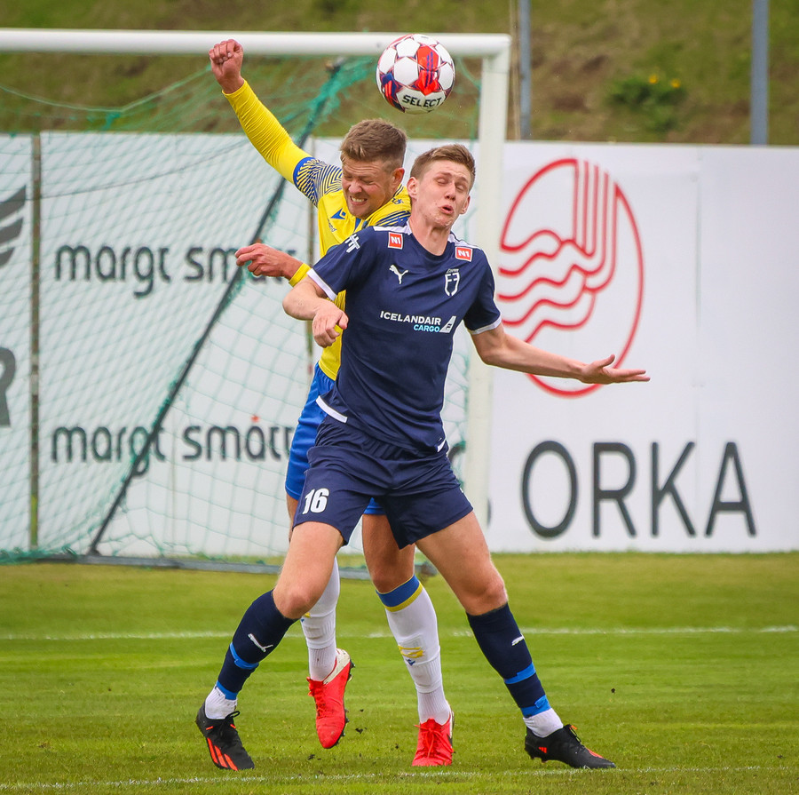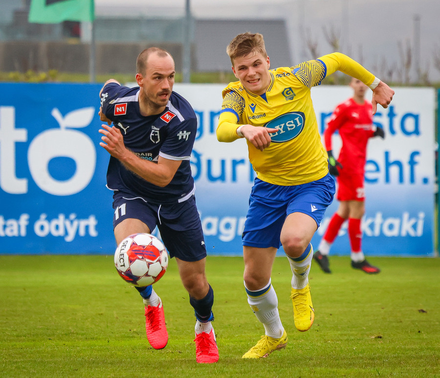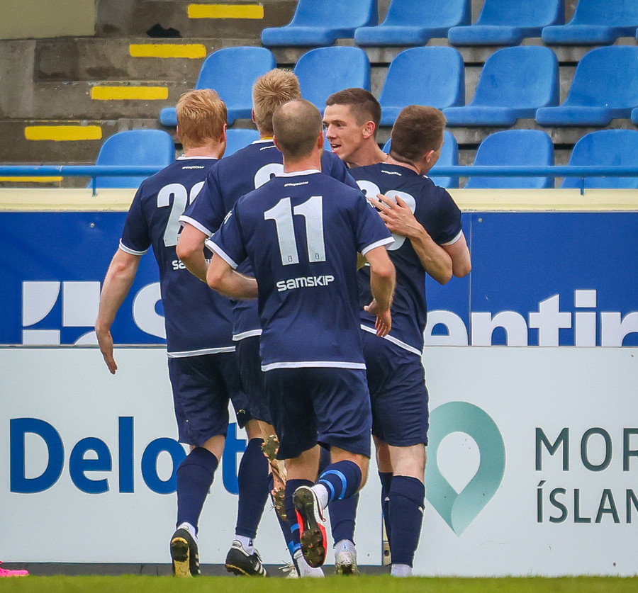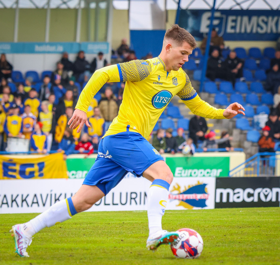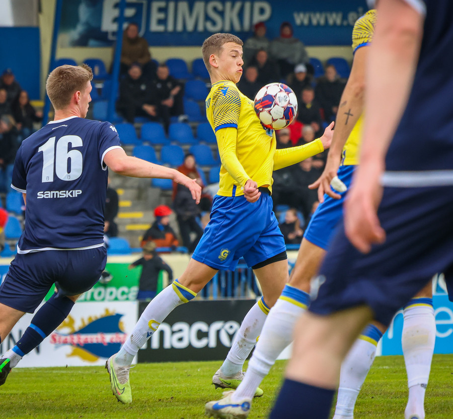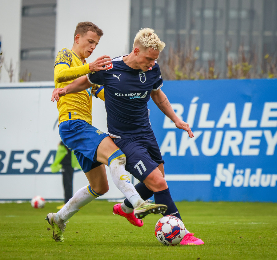 Dofri Snorrason með boltann úti til hægri á frábæra sendingu í svæðið milli varnar og markmanns. Þar rennir Hákon sér í boltann, Aron Dagur frosinn á línunni en lukkan er með honum. Boltinn í stöngina og þaðan í fang Arons.