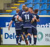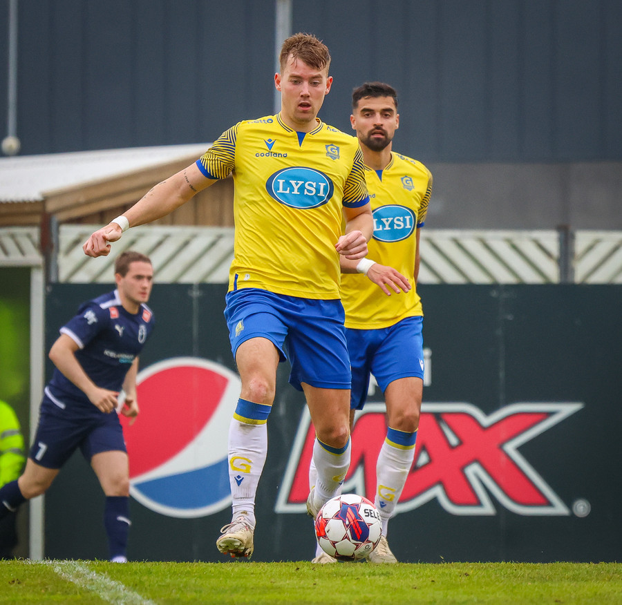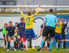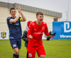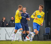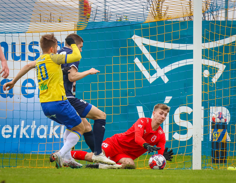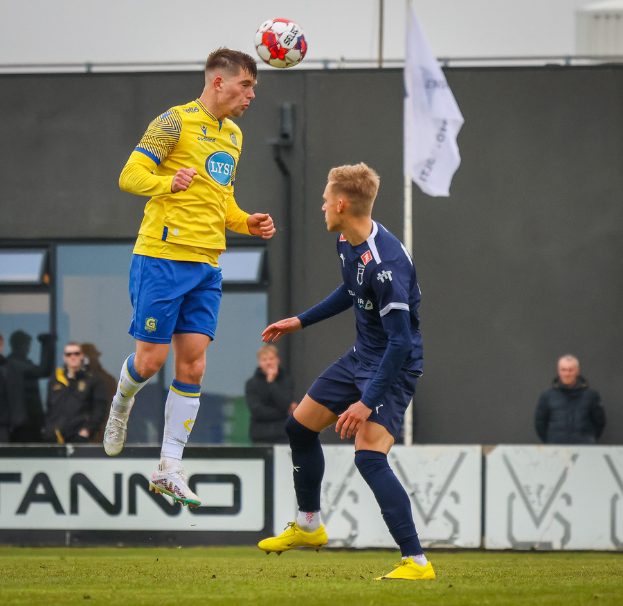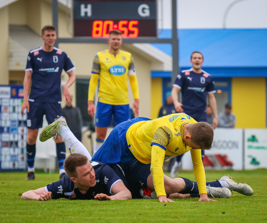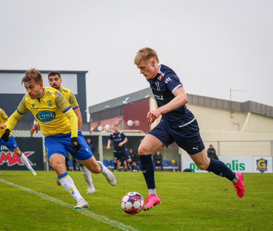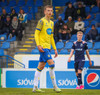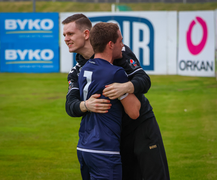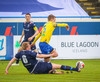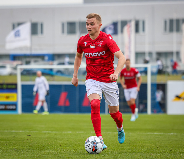 Dofri Snorrason með boltann úti til hægri á frábæra sendingu í svæðið milli varnar og markmanns. Þar rennir Hákon sér í boltann, Aron Dagur frosinn á línunni en lukkan er með honum. Boltinn í stöngina og þaðan í fang Arons.