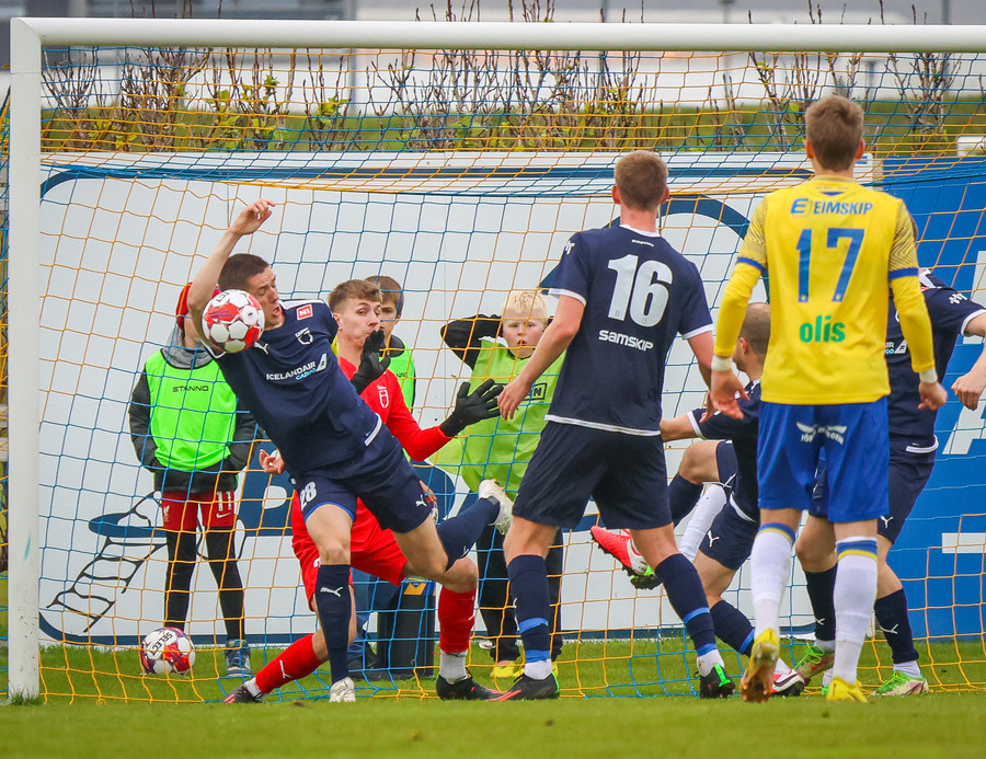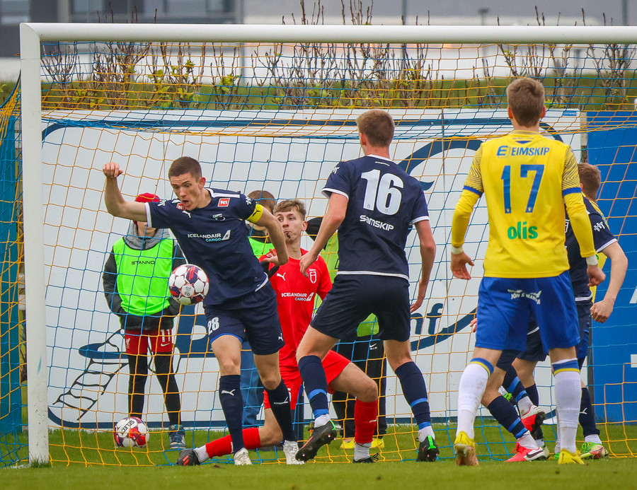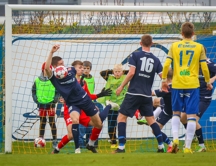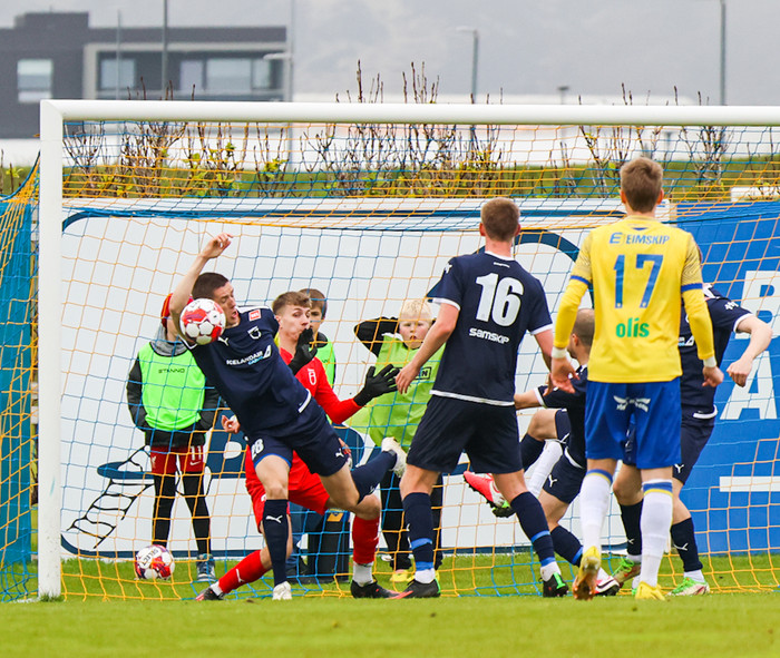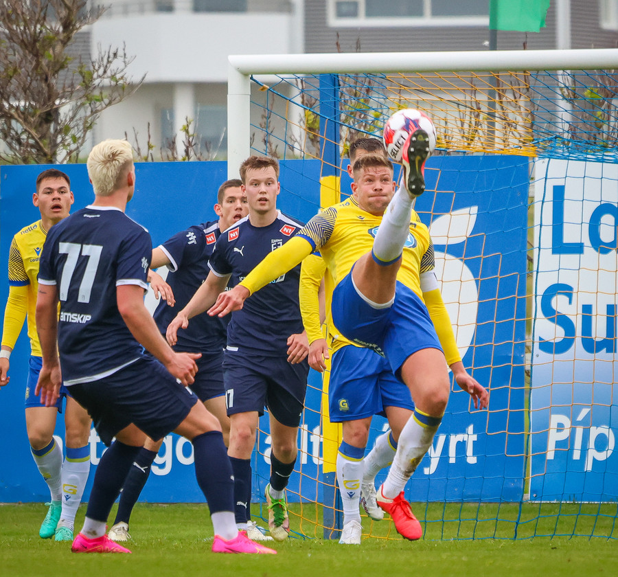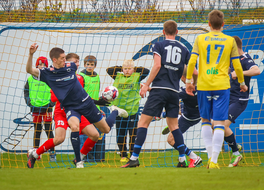 Júlíus Mar ætlaði svoleiðis að þruma á markið af um þrjátíu metra færi. Setti allt sitt í skotið sem sveif hátt yfir markið og lendir líklega í Bláa Lóninu miðað við flug boltans.