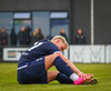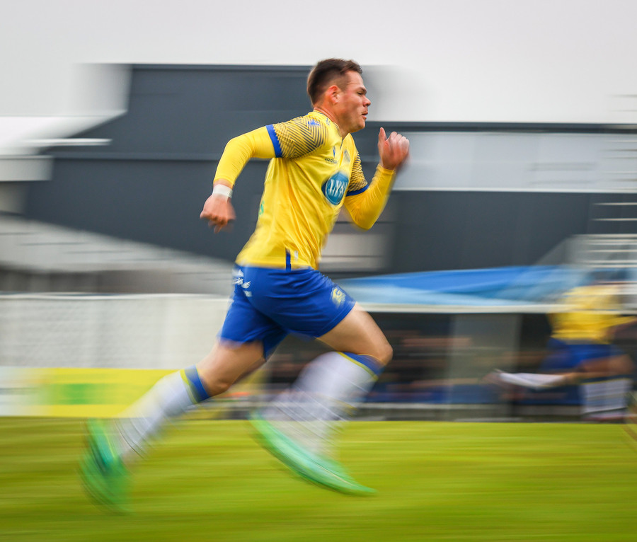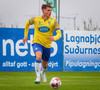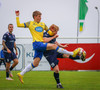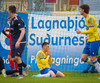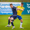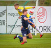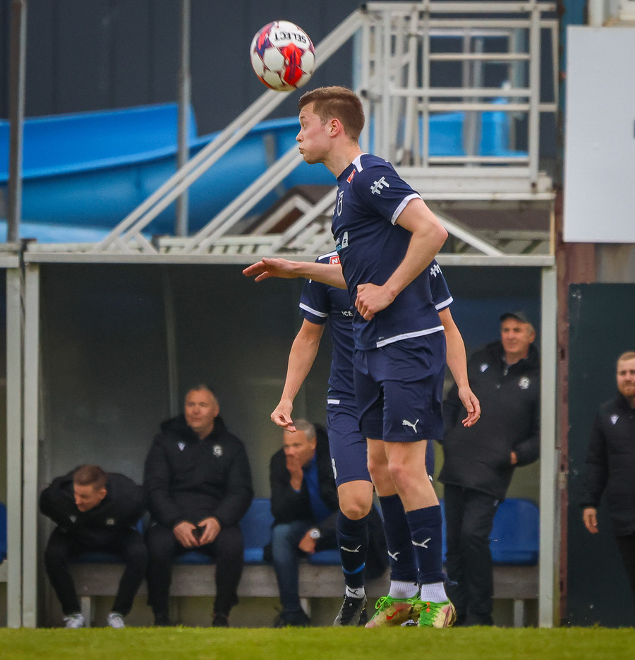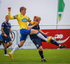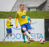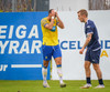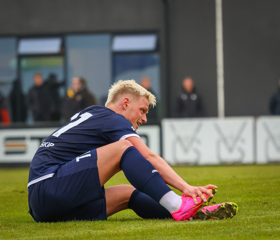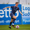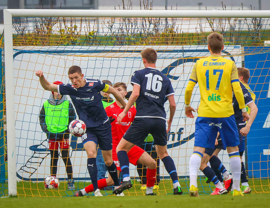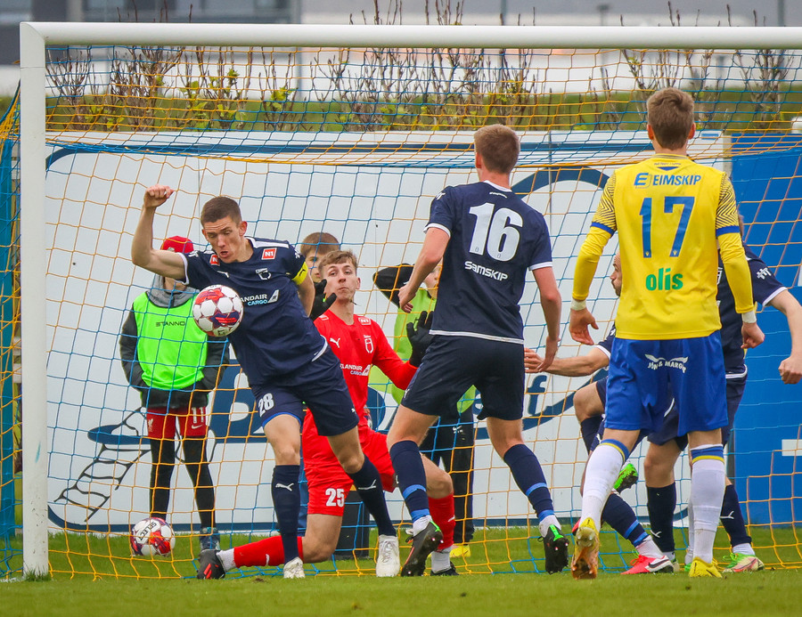 Júlíus Mar ætlaði svoleiðis að þruma á markið af um þrjátíu metra færi. Setti allt sitt í skotið sem sveif hátt yfir markið og lendir líklega í Bláa Lóninu miðað við flug boltans.