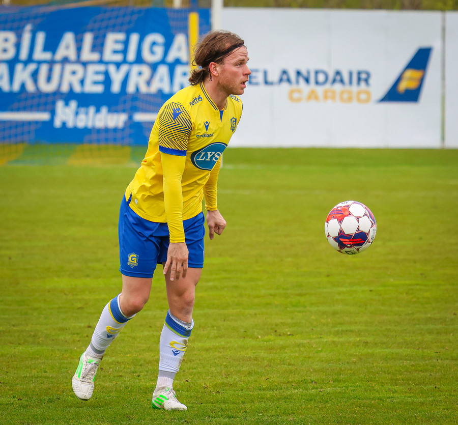 Símon Logi í dauðafæri í teignum eftir hornið en skallar boltann yfir af stuttu færi.