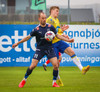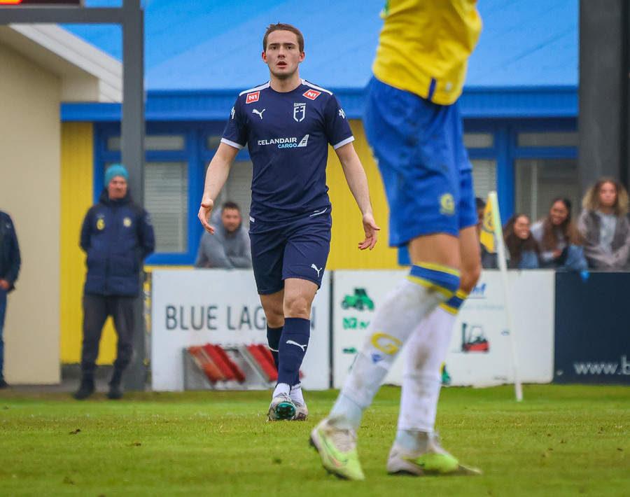 Daníel Ingvar Ingvarsson með hættulegan bolta fyrir mark Grindavíkur frá hægri. Hákon Ingi skrefinu of seinn og nær ekki til boltans.