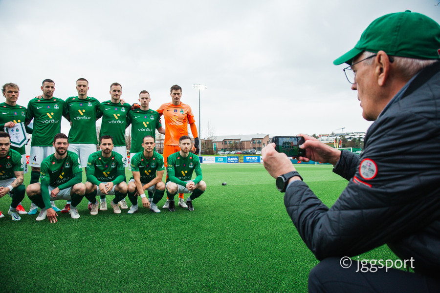 Flosi formaður vildi þó ekki byrja að fagna strax. Pjetur hjá KSÍ fékk sér vængi og yfirmenn fótboltamála ræddu saman; Jörundur Áki og Óli Kristjáns. Þorði ekki að trufla þær samræður.