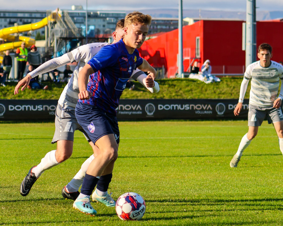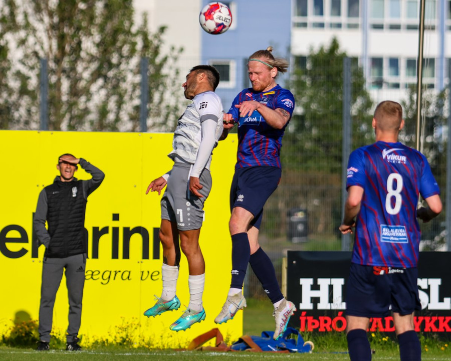 Atli Rafn liggur þjáður í grasinu eftir hörku tæklingu. Hann fær aðhlynningu og spurning hvort hann heldur áfram leik