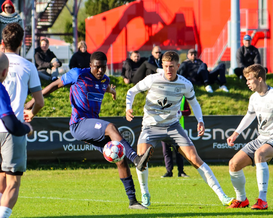 Leiknismenn spila beinskeytt og setja boltan langt fram fyrir Sowe að elta. Hann er sterkari en andstæðingurinn og er kominn einn gegn markmanni en skotið er lélegt og auðveldlega varið.