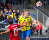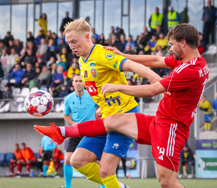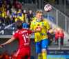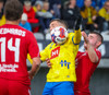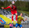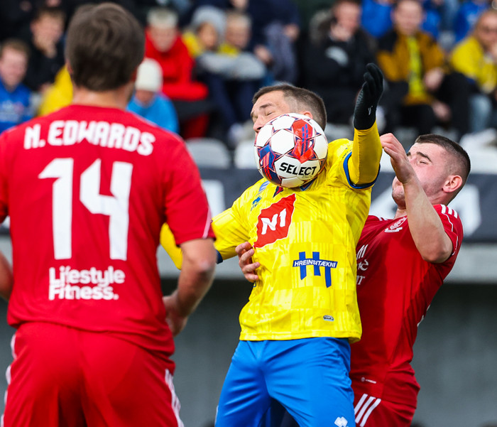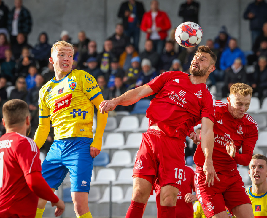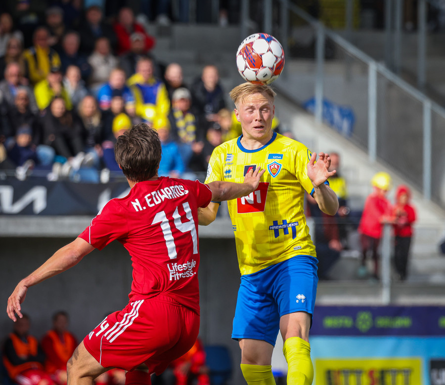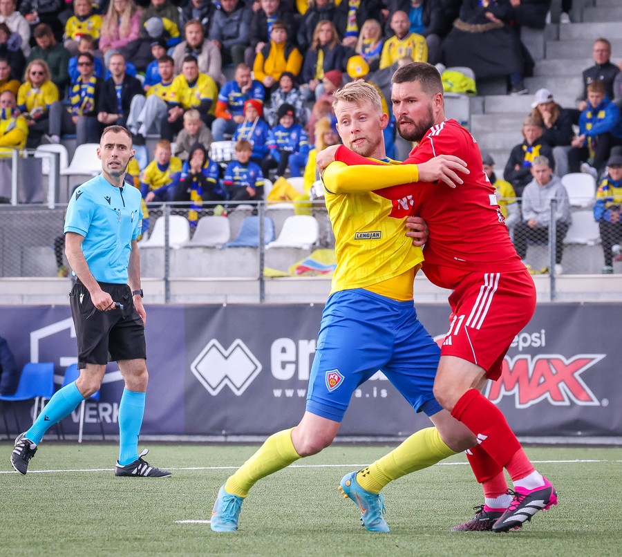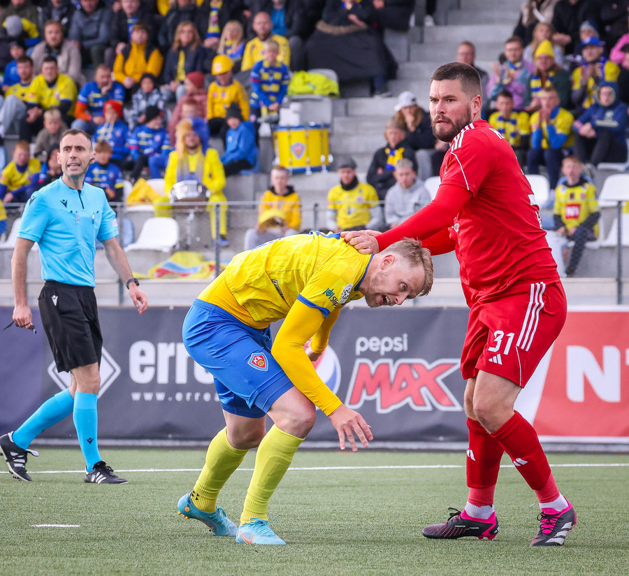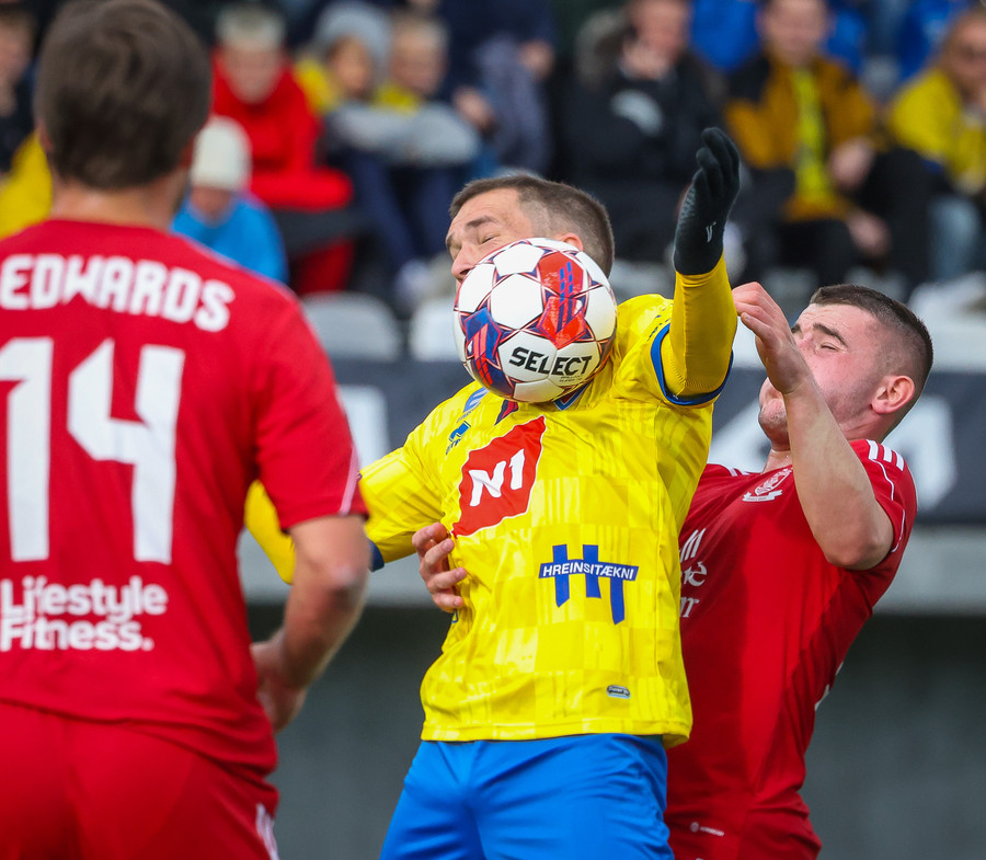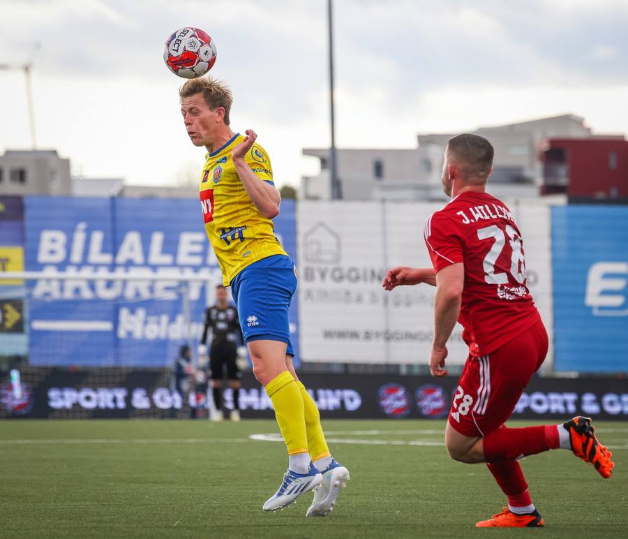 Stekkur upp í skallaeinvígi með Ívari en setur hendina í andlitið á honum.
