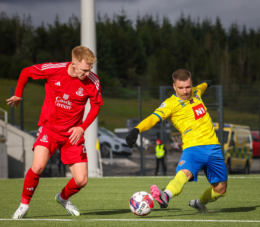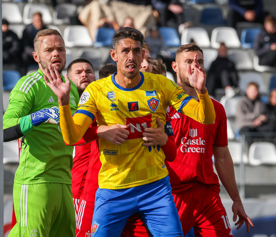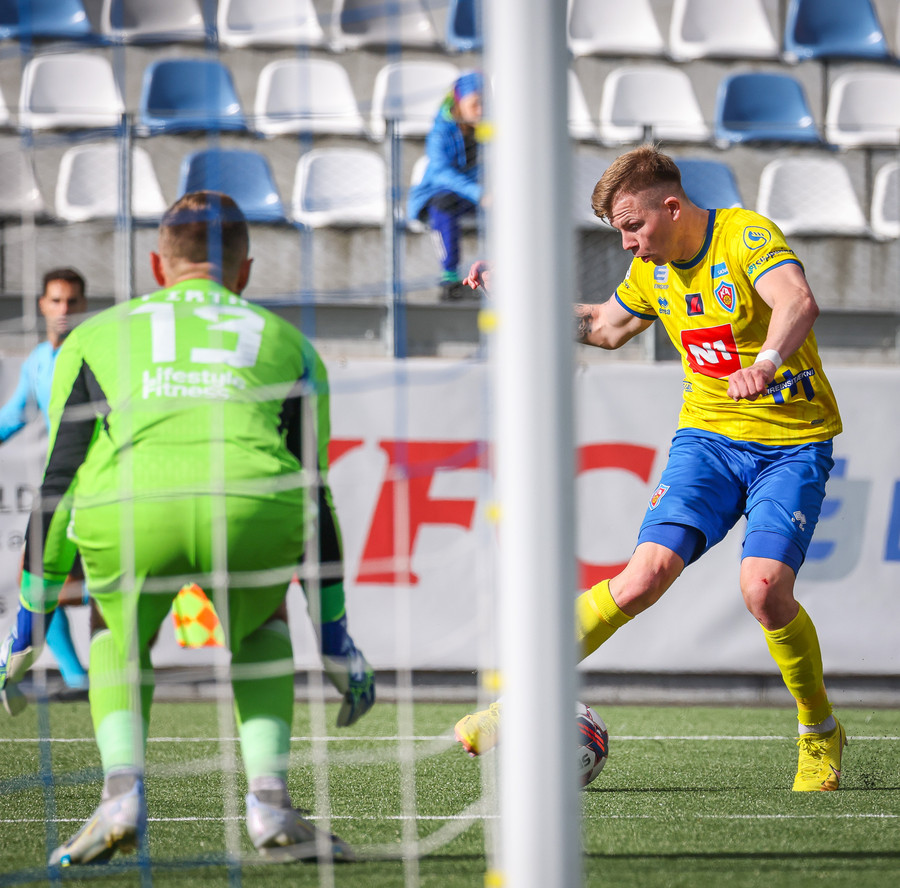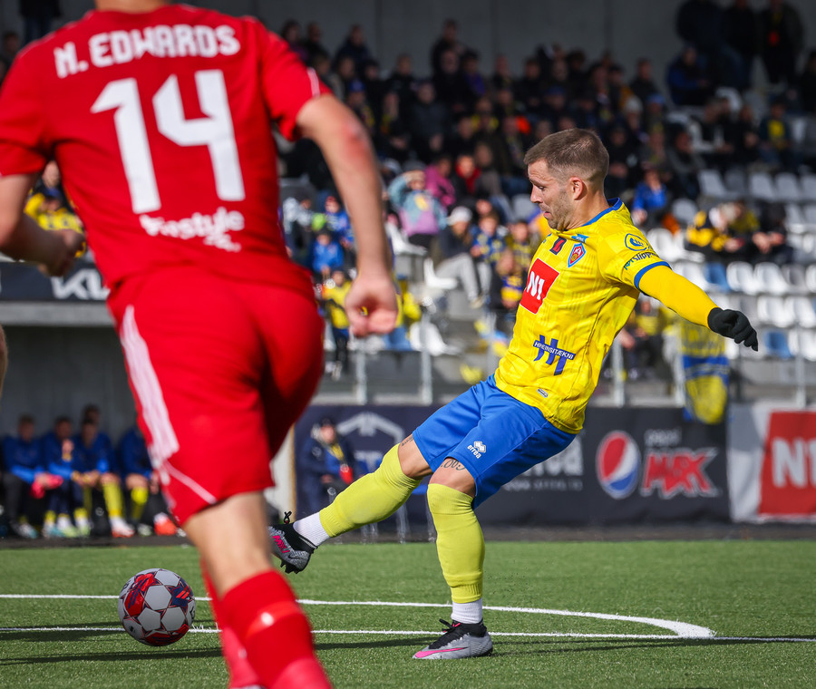 Declan Pool er á hægri kantinum og reynir fyrirgjöf sem fer framhjá öllum og er hársbreidd frá því að fara bara stöngina og inn, en fór framhjá.