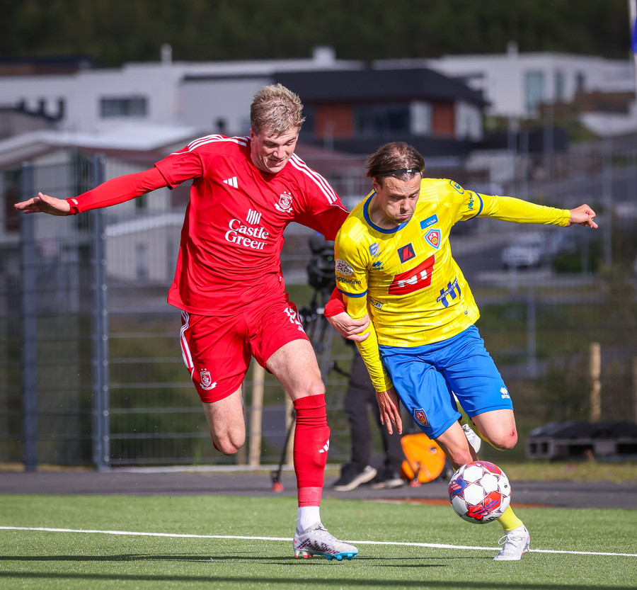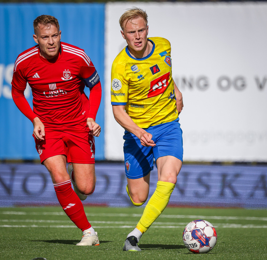 Það kemur langi bolti fram og Pætur getur hlaupið bara beint á markið, hann hikar hinsvegar of mikið og nær bara fyrirgjöf í varnarmann og færið rennur út í sandinn.