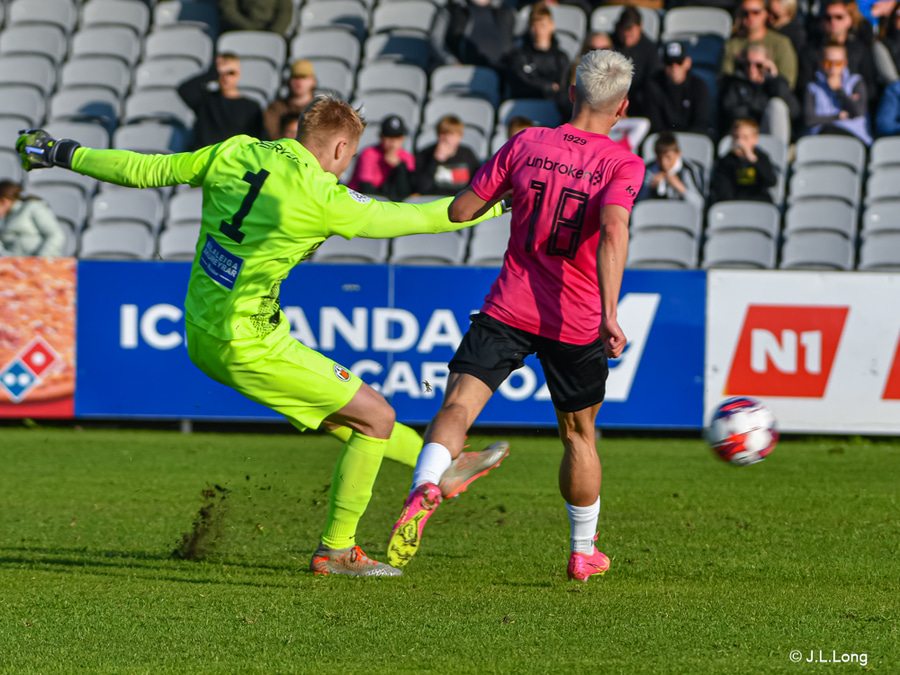 Luke Nálægt því að skora með sinni fyrstu snertingu. Geggjaður bolti frá Atla innfyrir á Luke sem lætur vaða en Sindri ver í horn
