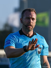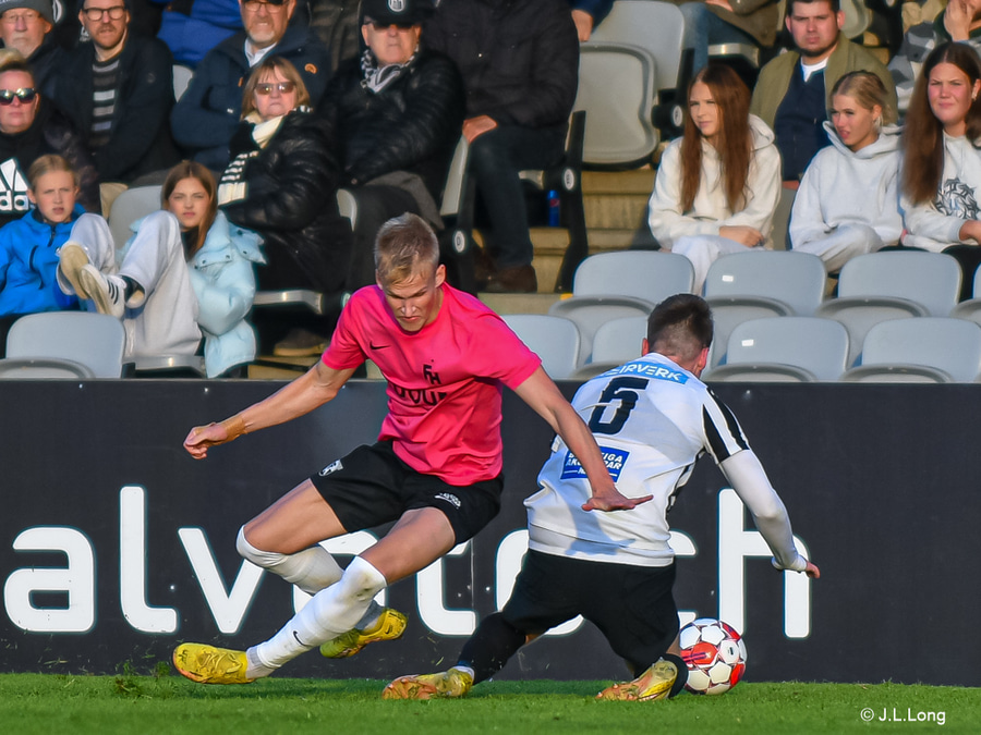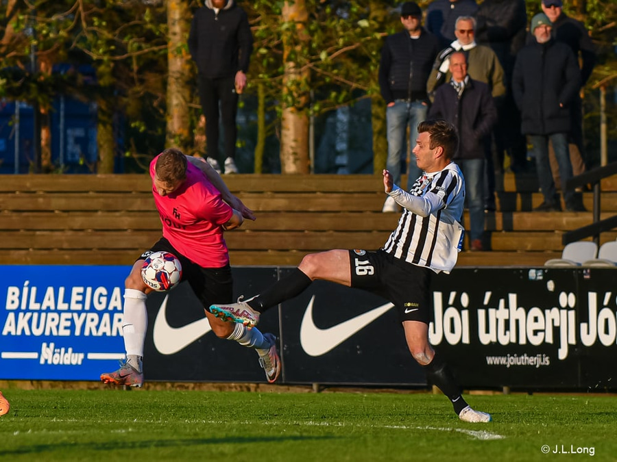 Kjartan Kári er að sleppa í gegn og Simen Lillevik Kjellevold virðist taka hann niður en Sigurður Hjörtur, dómari leiksins, er ekki á því að um brot hafi verið að ræða.