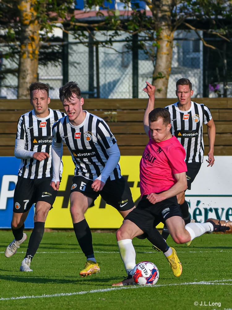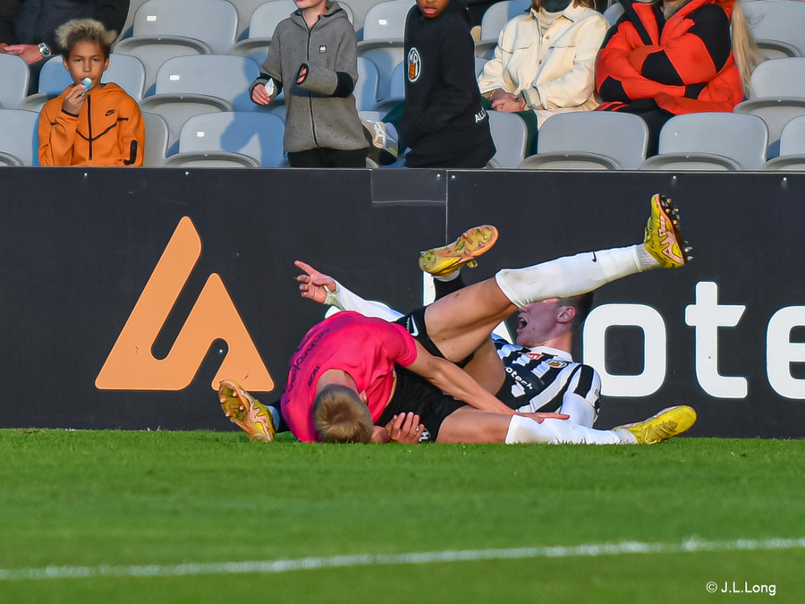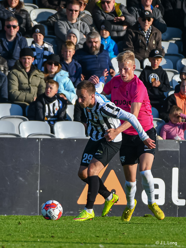 Sindri Kristinn var tæpur þarna. Ætlar að þruma fram en setur boltann beint í Benoný og þaðan fer hann afturfyrir.