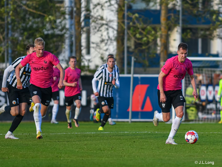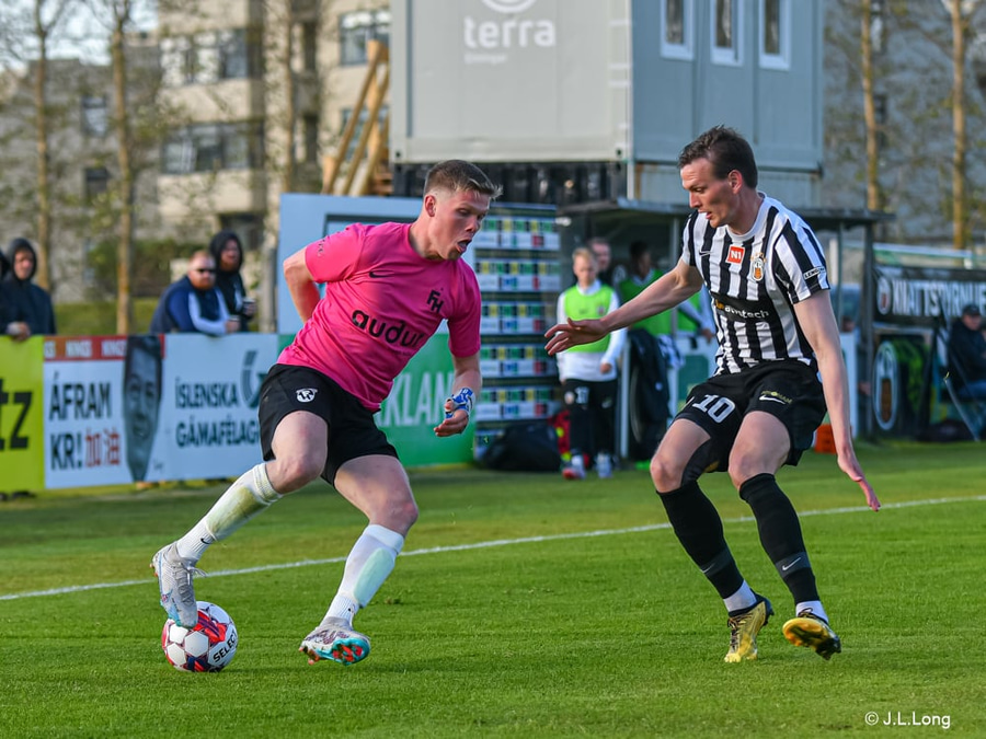 KR er í sínum hefðbundnu svörtu og hvítu treyjum en FH er í bleiku varatreyjunum sínum