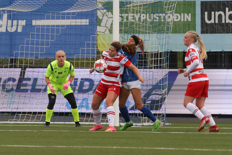 Sylvía með geggjaða sendingu inn í teig en Telma gerir vel í vörninni og hreinsar.