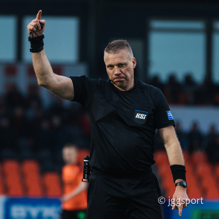 Pétur Guðmundsson dómari leiksins flautar til leiks. Fram byrjar með boltann.