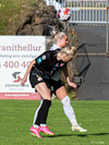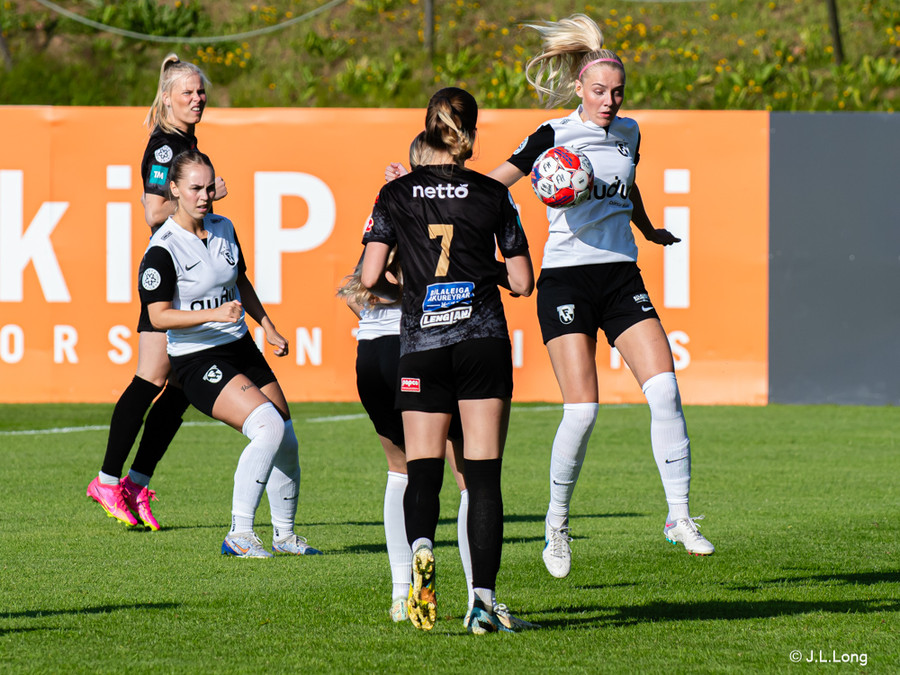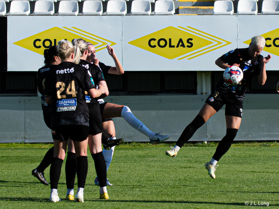 Margrét Árnadóttir á flottan skalla að marki en boltinn fer í varnarmann FH og koma þær svo hættunni frá.