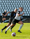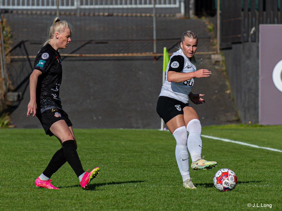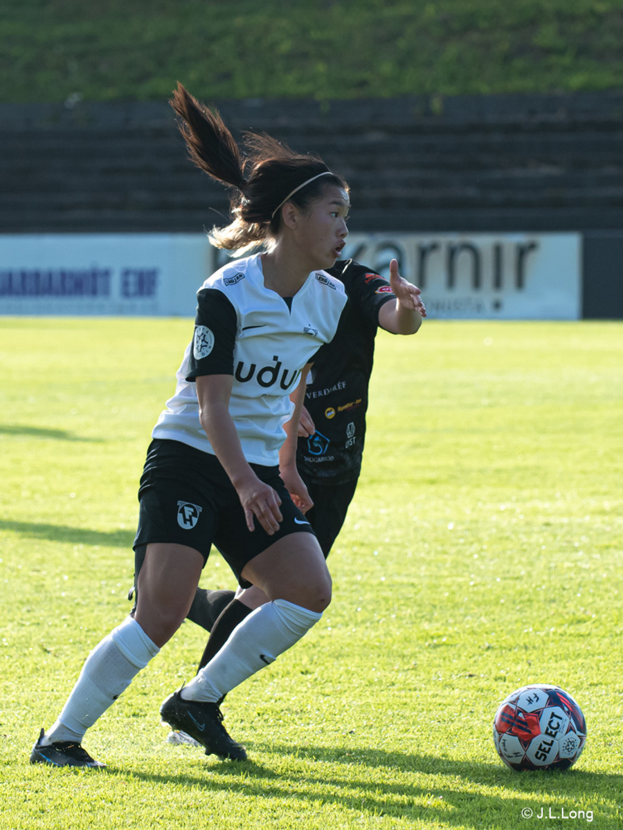 Alma Mathiesen æðir að marki og fer í skot sem endar í varnarmanni og í FH hornspyrnu.