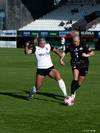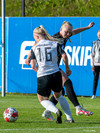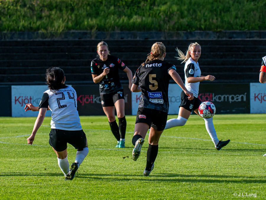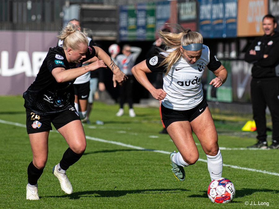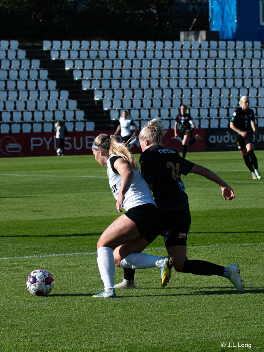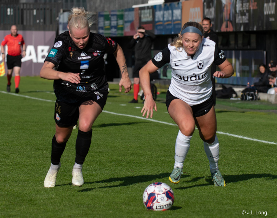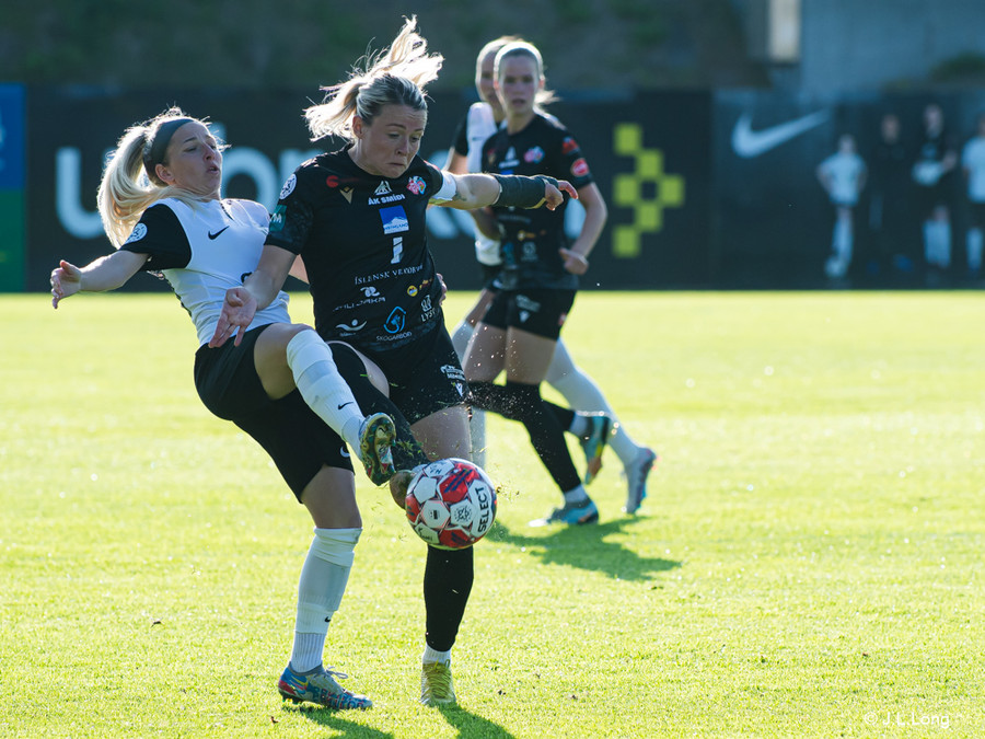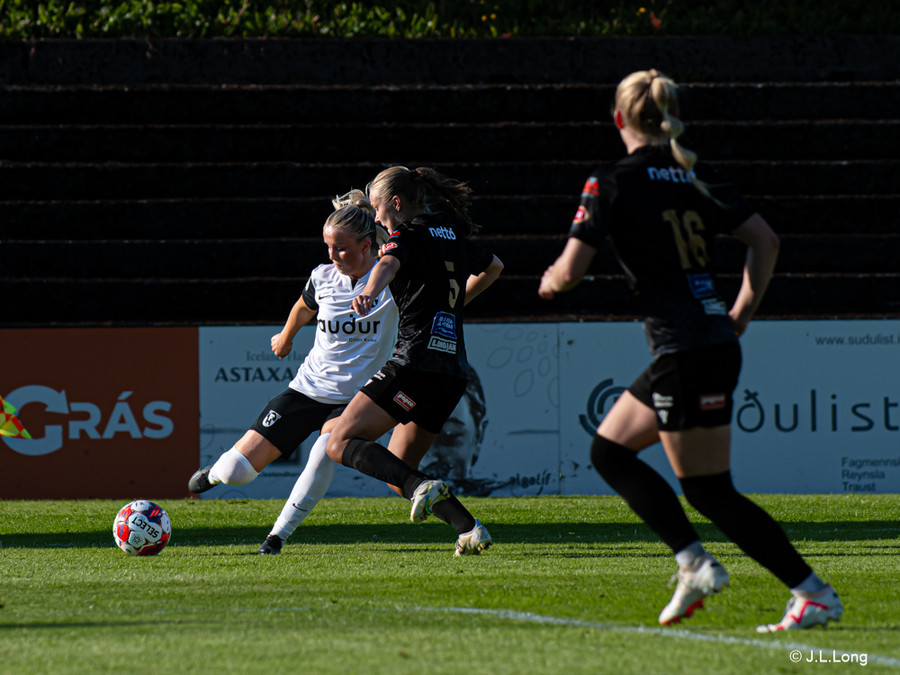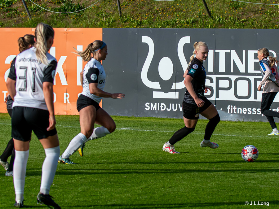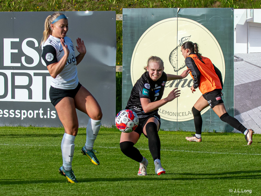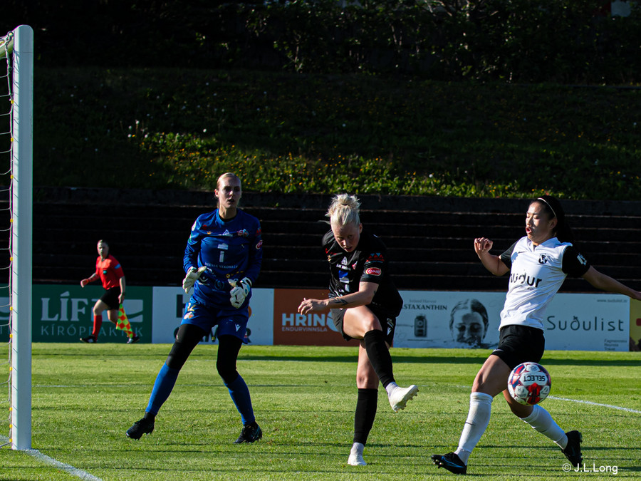 Karen María vinnur boltann vel af Hörpu Helgadóttur. Karen leitar svo af skotinu sem hún finnur og kemur boltanum í netið!