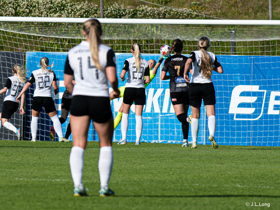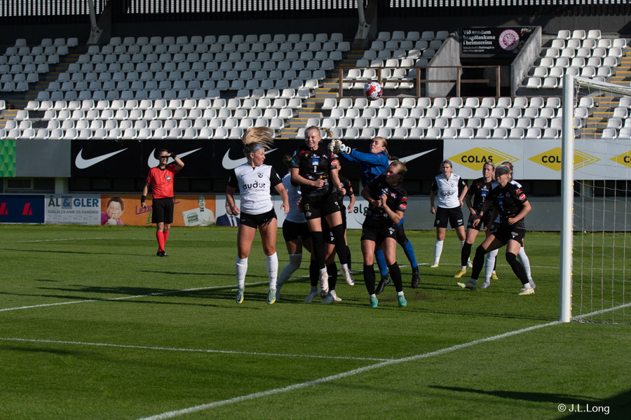 FH fær aukaspyrnu, boltinn berst á Valgerði sem á gott skot en Melissa nær að blaka boltanum frábærlega yfir.