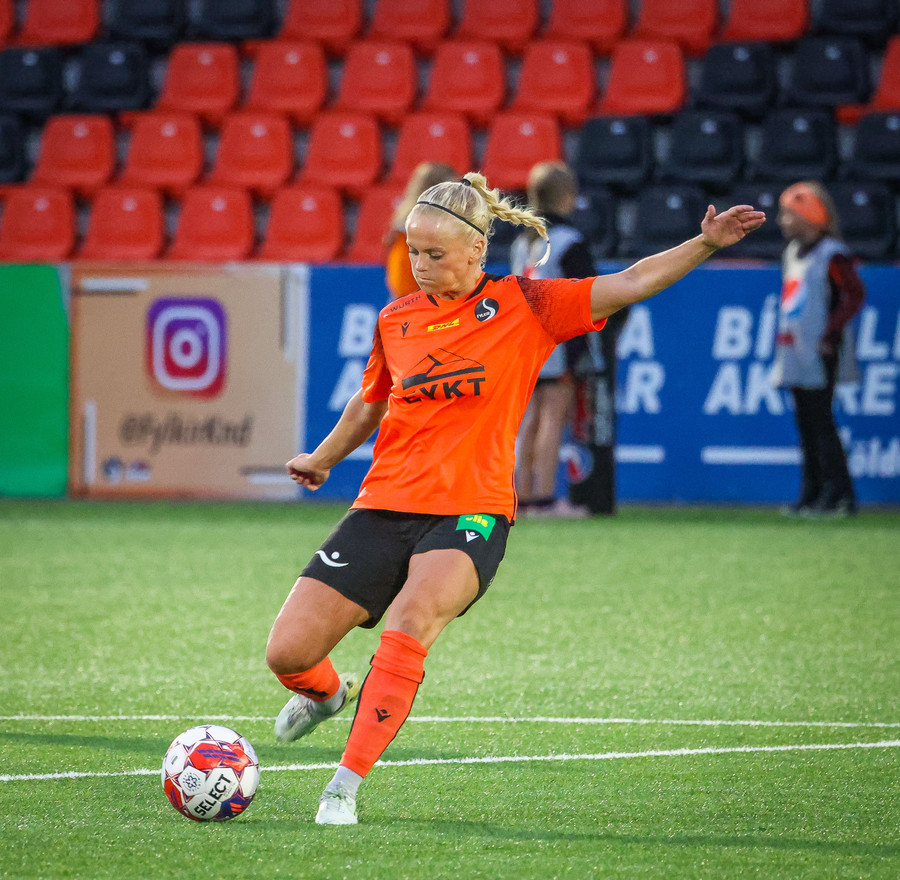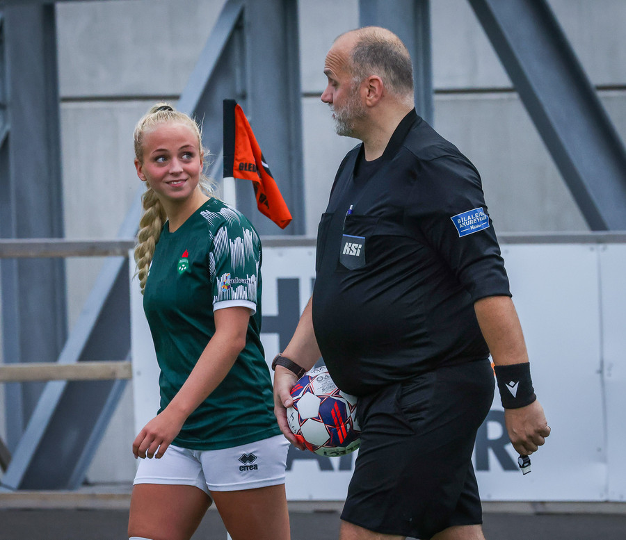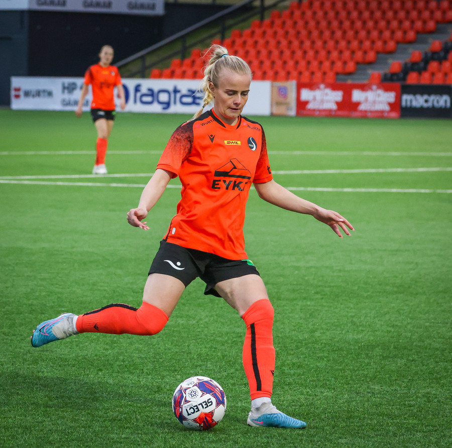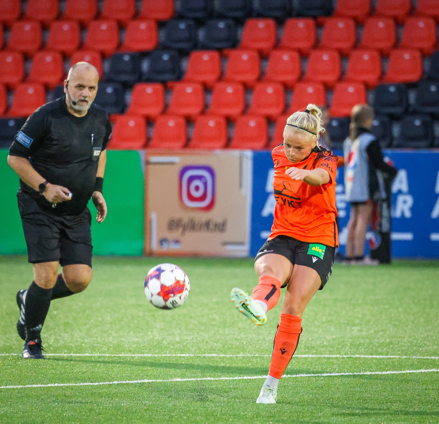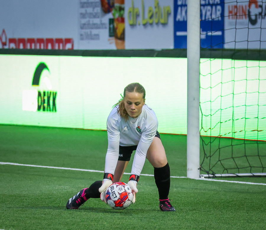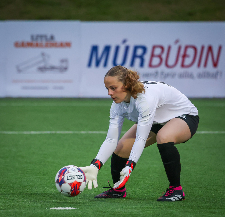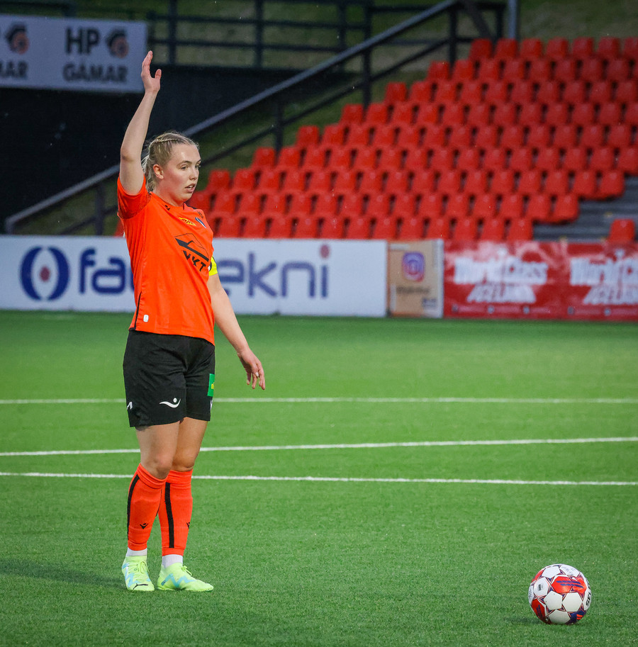 Augnablik vinnur aukaspyrnu sem, Bryndís býr sig undir að taka.