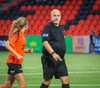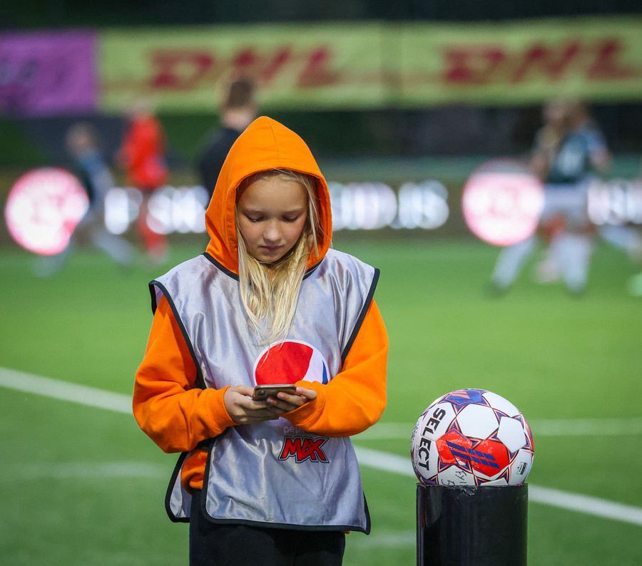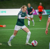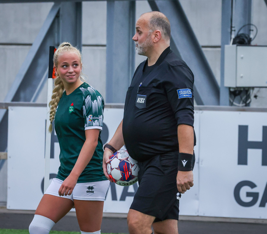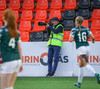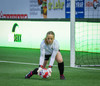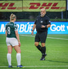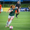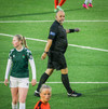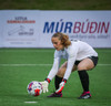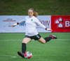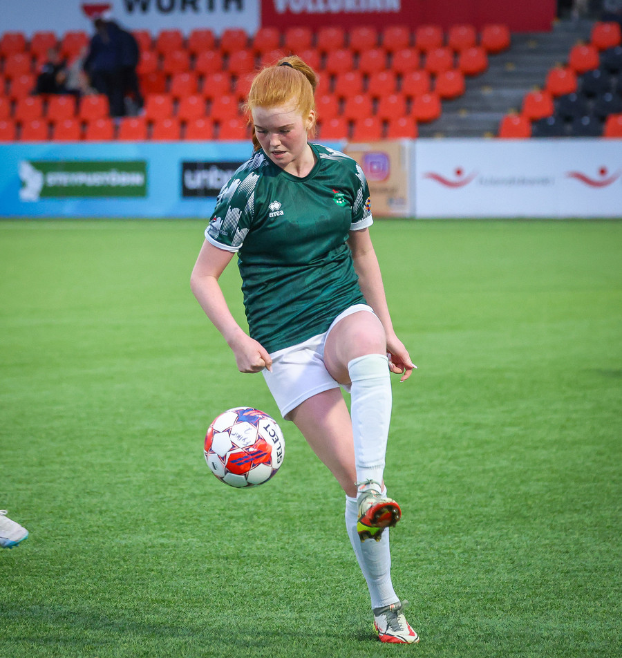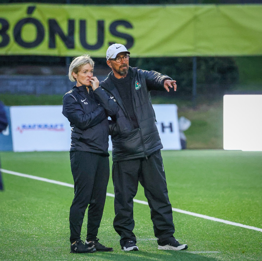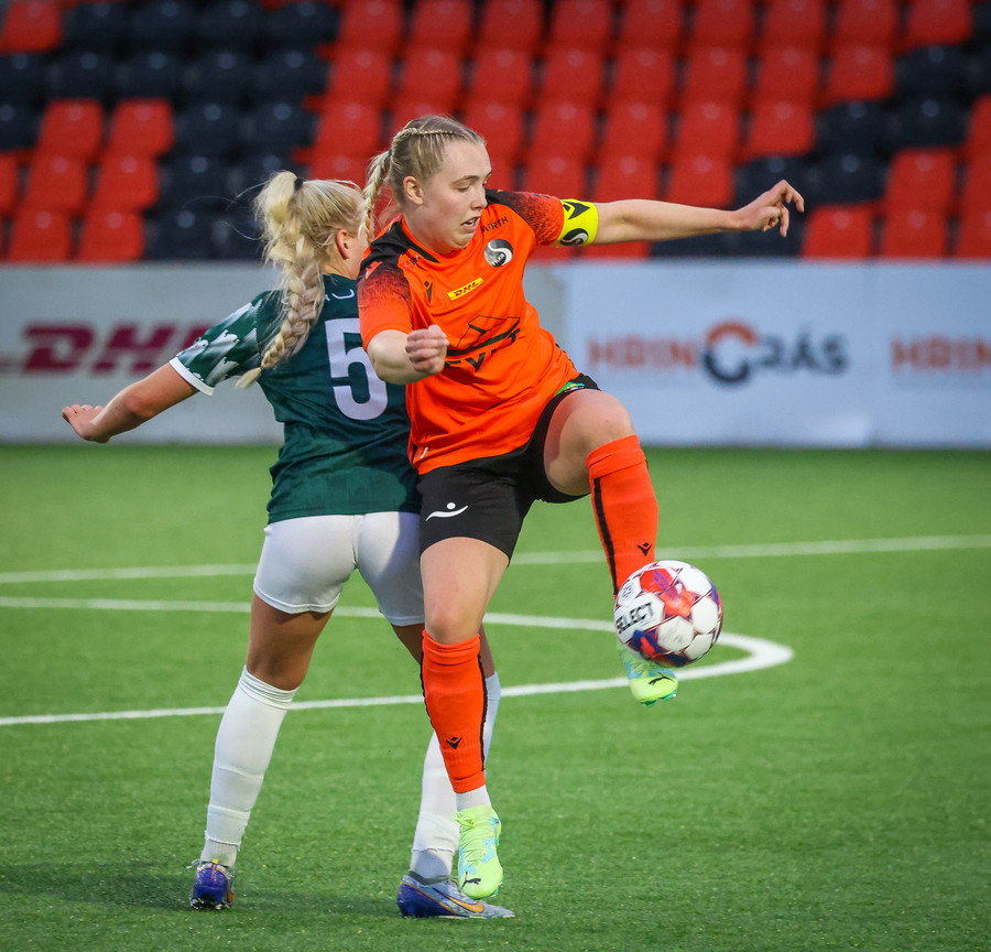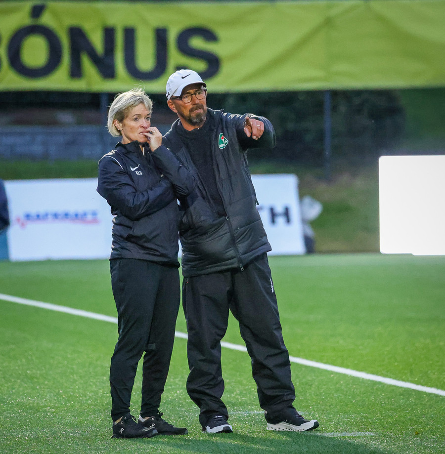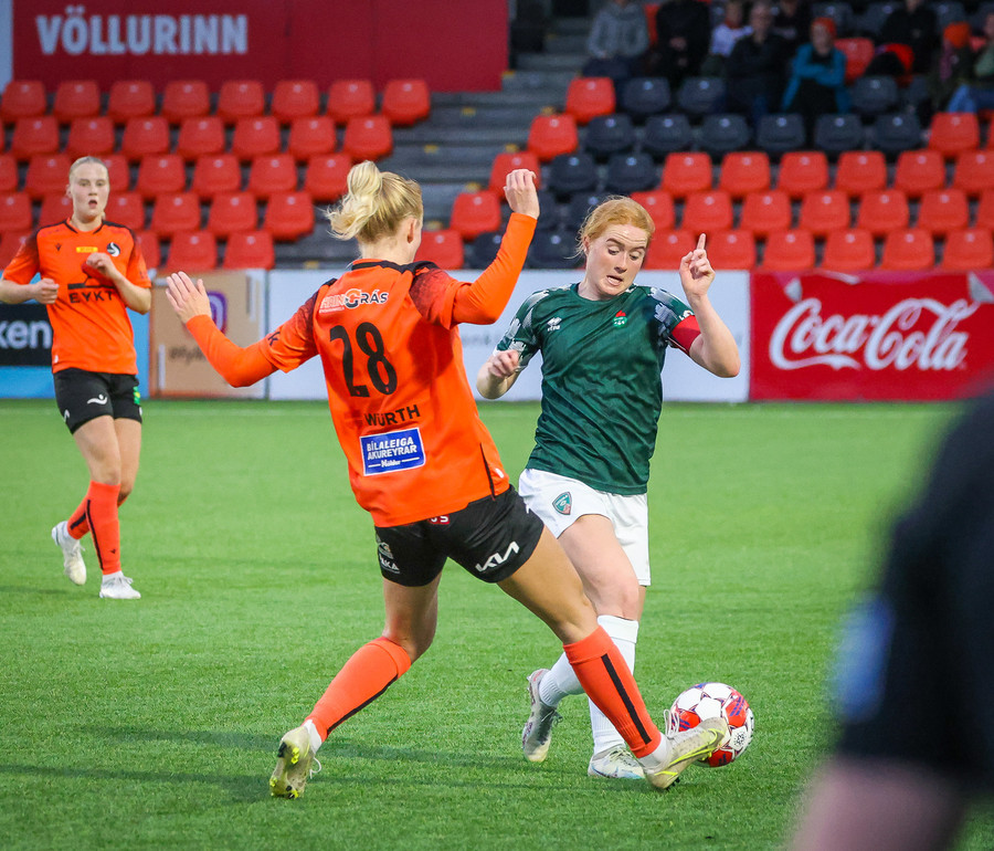 Augnablik vinnur aukaspyrnu sem, Bryndís býr sig undir að taka.