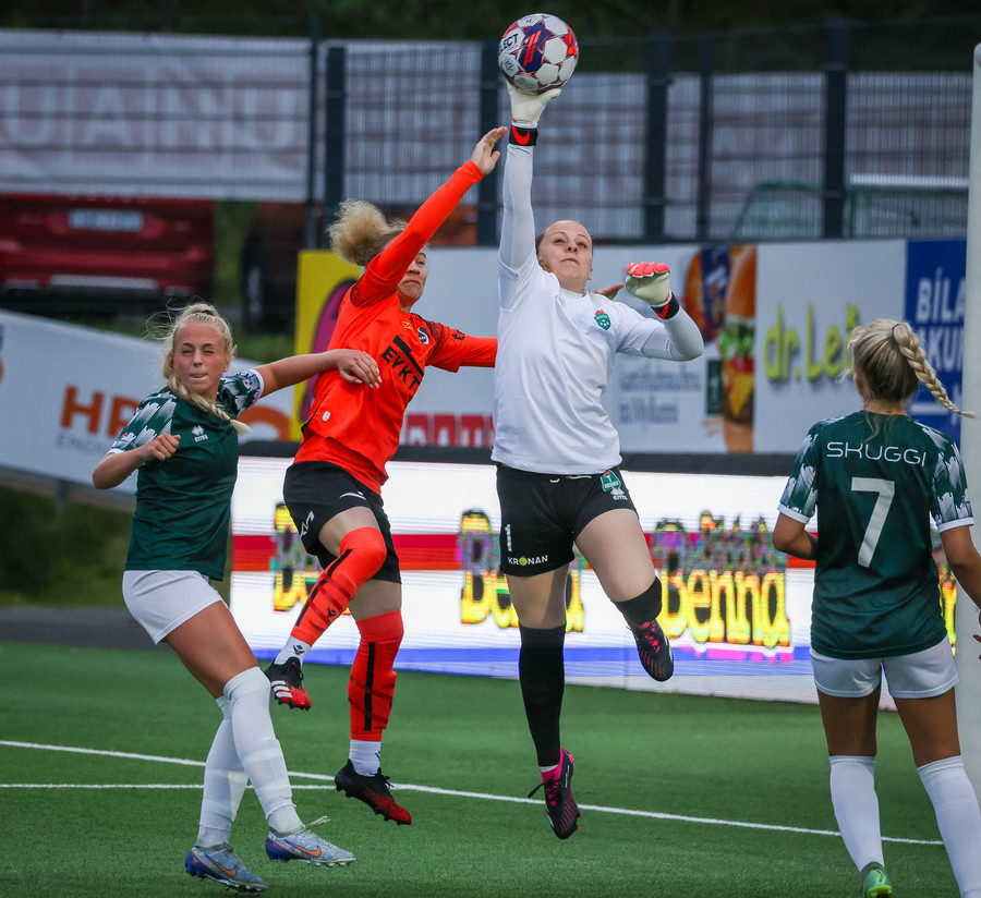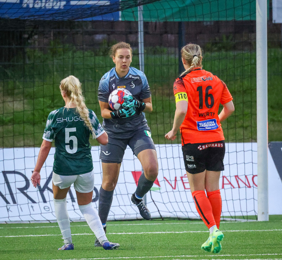 Eva Rut fær boltan alein á teignum en skýtur beint í fangið á Evu. Þetta hefði getað farið verr fyrir Augnablik.