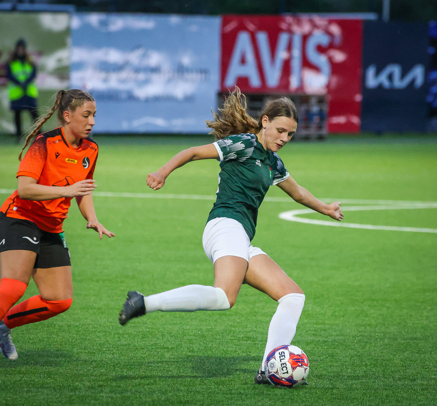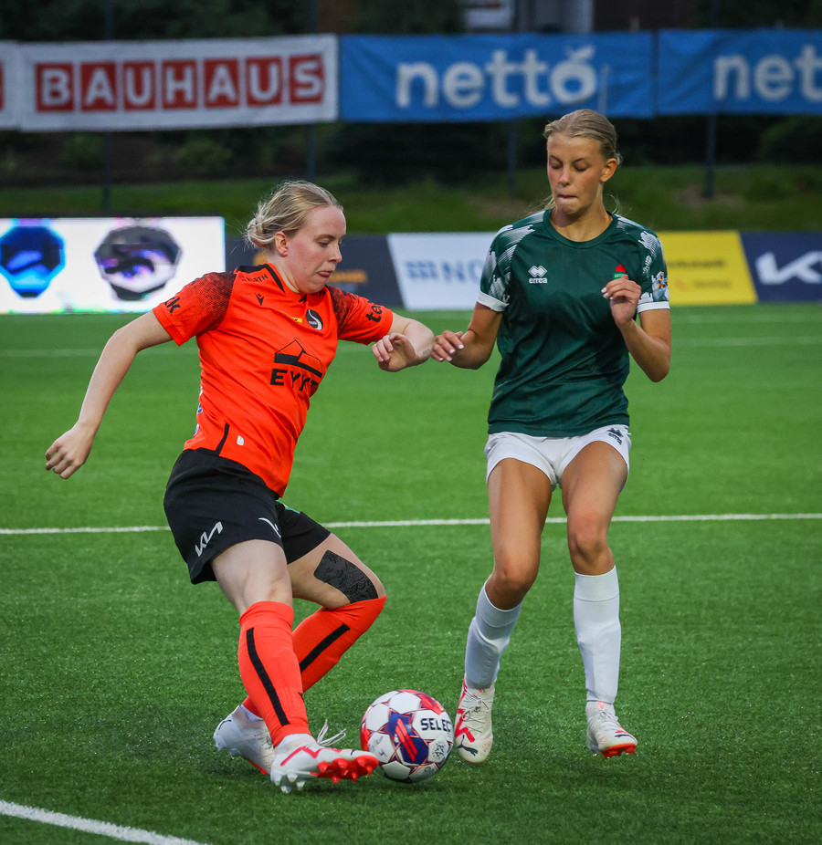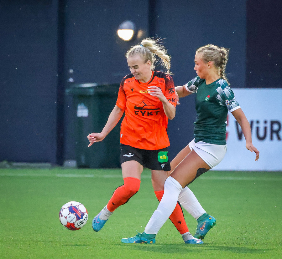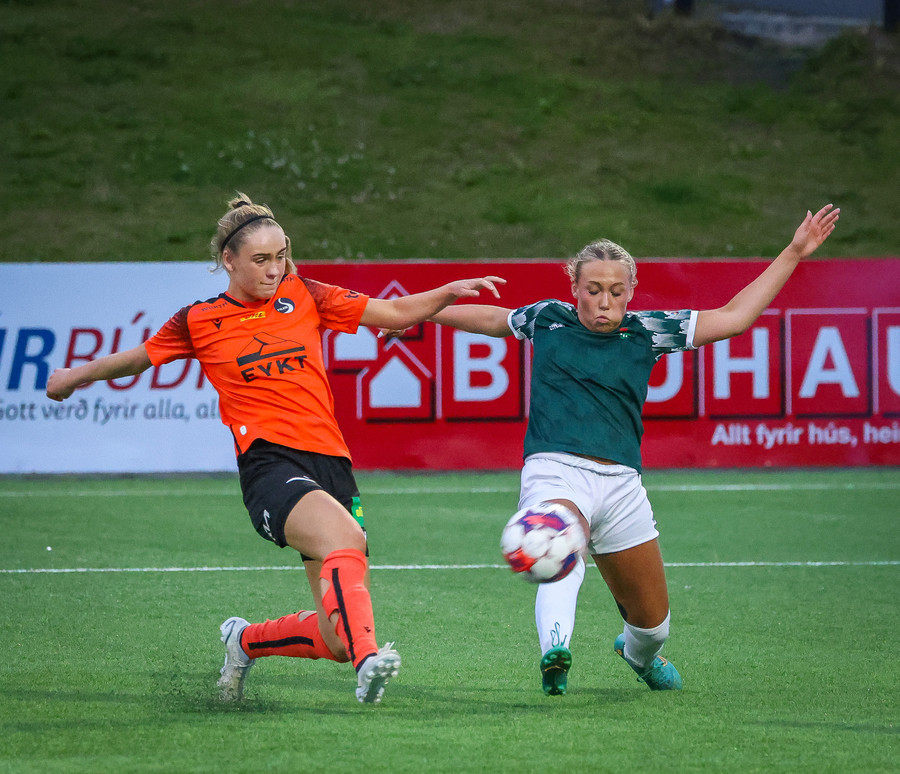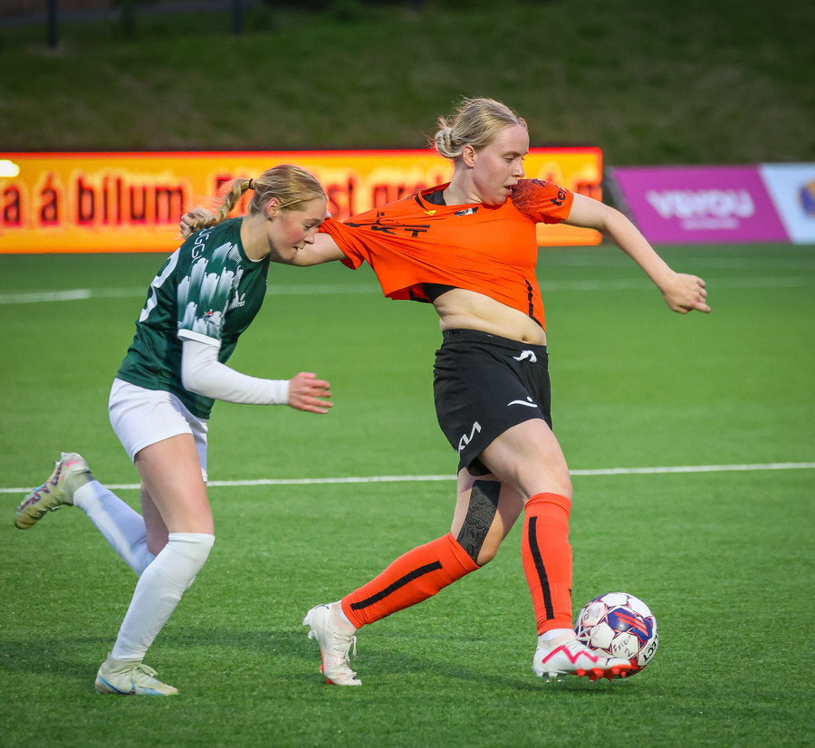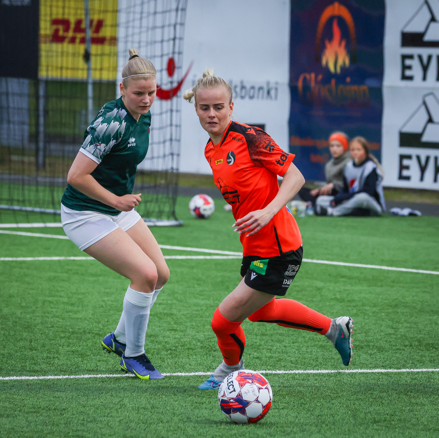 Díana með geggjaðan sprett rúllar honum út í teiginn á Bryndísi sem á geggjað skot sem Tinna rétt svo ver yfir markið.